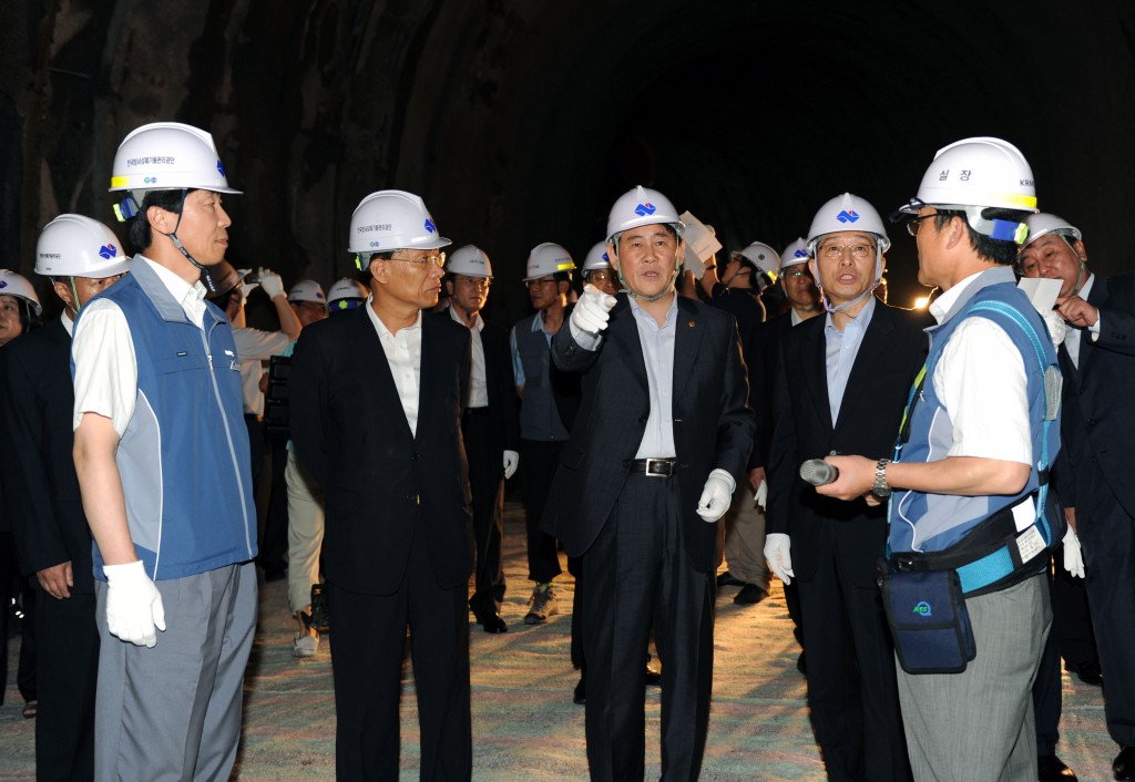Minister of Knowledge Economy Choi Kyunghwan (third from left) talks to a worker during a visit to a radioactive waste disposal facility construction site in Gyeongju on August 5. date2010-08-11