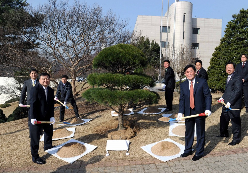 Minister of Knowledge Economy Choi Kyunghwan (right, front) and senior MKE officials plant a tree at the Gwacheon Government Complex on April 5 to commemorate Arbor Day. The tree symbolizes the government’s determination to pursue low-carbon, green growth. date2010-04-08