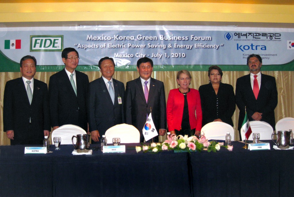 Minister of Knowledge Economy Choi Kyunghwan (center) stands with other leaders at a business forum held July 1 in Mexico. Participants discussed the need to form partnerships to save energy, combat climate change and promote renewable energy. date2010-07-07