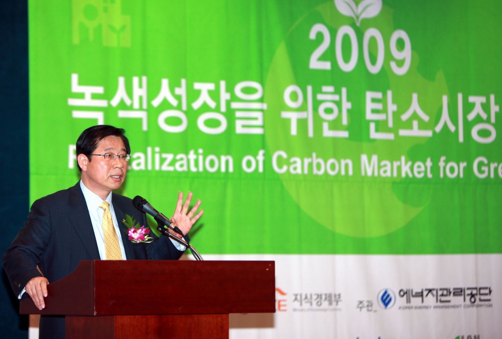 Vice Minister Addresses International Forum on Carbon Markets Vice Minister for Trade and Energy Kim Young Hak speaks at an international forum on carbon markets in Seoul on April 28. Addressing representatives of businesses, civic groups and research institutes, Vice Minister Kim called active carbon markets an important first step toward sustainable growth and an end to climate change. The theme of the forum was “revitalization of carbon markets for green growth.” date2009-05-06
