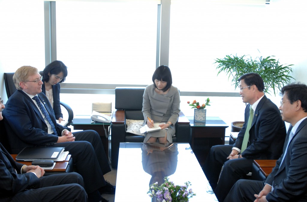 Vice Minister for Trade and Energy Kim Young Hak greets Secretary of Energy and Foreign Affairs Jean-Paul Terra Prates, representing the Brazilian state of Rio Grande do Norte, on April 9 at Vice Minister Kim’s office in Gwacheon, south of Seoul. The two officials discussed Korean participation in Brazil’s oil projects and bilateral cooperation in the plant industry. date2009-04-14