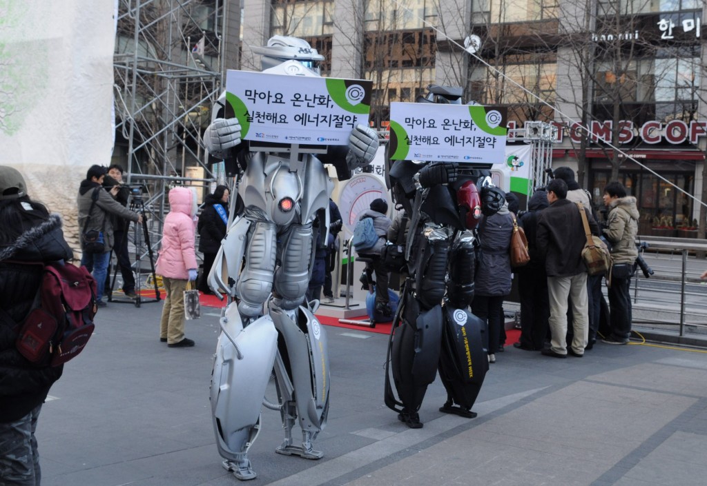 The Ministry of Knowledge Economy holds an environmental awareness event in Seoul on February 18, reaffirming its commitment to the fight against climate change and encouraging the public to reduce its carbon footprint. The signs read, “Address Global Warming, Conserve Energy.” date2009-02-24