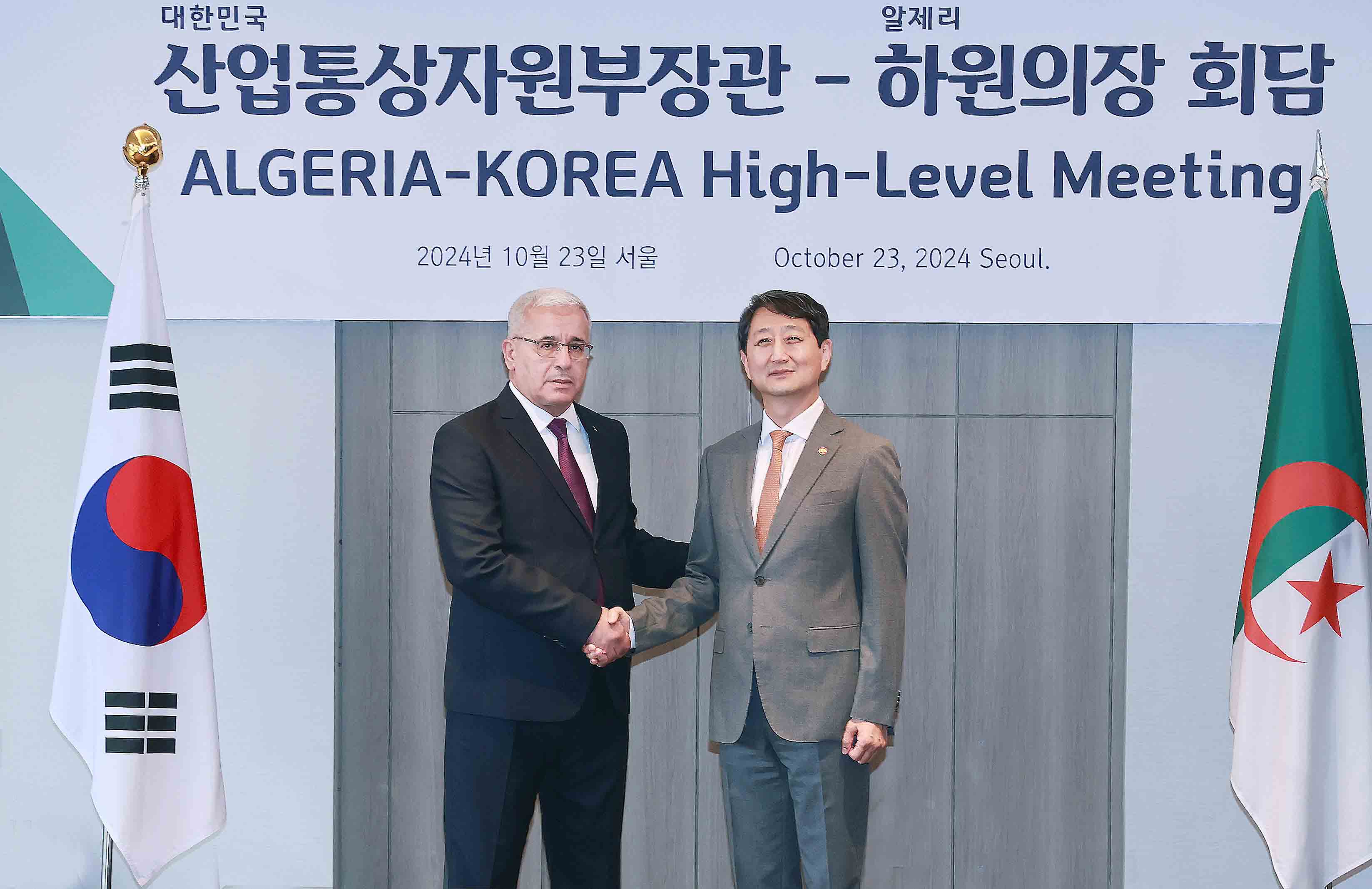The Republic of Korea’s Minister for Trade, Industry and Energy Dukgeun Ahn met Algeria's National People's Assembly (APN) President Brahim Boughali today in Seoul to discuss measures for wider economic cooperation between the two countries. The bilateral meeting was convened on the occasion of Assembly President Boughali’s visit to Korea, succeeding the Algerian president’s visit in 2003. As a follow-up to the recent Korea-Africa Summit (June), today’s high-level exchanges aim to strengthen Korea’s economic cooperation with Algeria, the only African country at present with which Korea is in a strategic partnership. Minister Ahn expressed appreciation for Assembly President Boughali’s strong support towards resolving the challenges experienced by Korean plant companies operating in the Algerian market and asked for the Algerian Assembly and government’s interest in Korean firms’ participation in Algeria’s social overhead capital (SOC) plant projects going forward. He also requested that Algeria’s recently tightened import regulations be eased, proposing that the two countries continue their cooperative ties for a forward-looking relationship through the signing of a bilateral Free Trade Agreement (FTA). Assembly President Boughali stated that Korea and Algeria are mutually complementary partners in view of Korea’s advanced technology and development know-how and Algeria’s rich population and resources. He expressed hope for Korean companies’ participation in Algeria’s industrial diversification efforts, suggesting that they swiftly resume the joint commission that has been on hiatus for 17 years. Minister Ahn welcomed the joint commission’s resumption and shared plans to activate working-level consultations, maintaining that the two countries’ trade and industry ministries promptly enter the Trade and Investment Promotion Framework (TIPF) memorandum of understanding (MOU) proposed by Korea as a platform for trade and economic cooperation. date2024-10-23