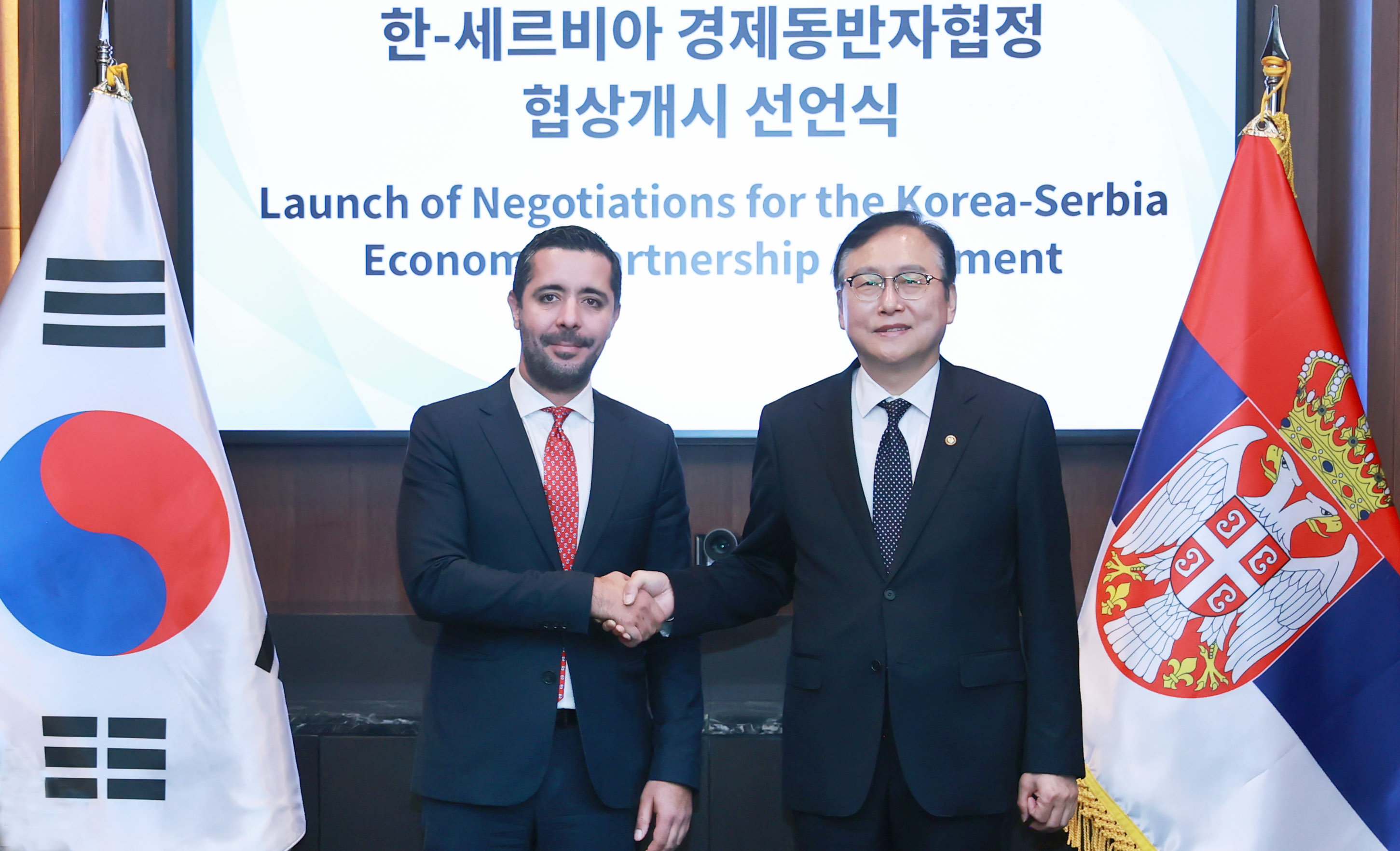 Korea’s Minister for Trade Inkyo Cheong and Serbia’s Minister of Domestic and Foreign Trade Tomislav Momirović jointly declared the launching of negotiations for the Korea-Serbia Economic Partnership Agreement (EPA) today in Seoul, announcing Korea’s first trade negotiations with a Balkan country. Strategically located in the center of the Balkan Peninsula in Southeast Europe, Serbia is rich in critical resources such as lithium and zinc. It is rapidly rising as Europe’s new production base based on its robust manufacturing sector and is already home to Korea’s car parts and mobility businesses. Going forward, the two countries can anticipate cooperation over advanced industrial supply chains such as battery and electric vehicles (EVs), as well as nuclear reactors in view of the Serbian government’s recent push for nuclear power development. Noting that this year commemorates the 35th anniversary of the establishment of Korea-Serbia diplomatic relations, Trade Minister Cheong expressed his expectations for the EPA negotiations to serve as an institutional basis for opening new horizons on the two countries’ cooperative ties, catalyzing bilateral collaboration across various areas including automobiles, high-tech, renewable energy, and nuclear reactors. In conjunction with the launch of negotiations, MOTIE also held a business conference with Korean companies operating in the Serbian market and other relevant institutions to discuss promising joint projects in information technology, bio, energy, and critical minerals supply chains. date2024-09-26