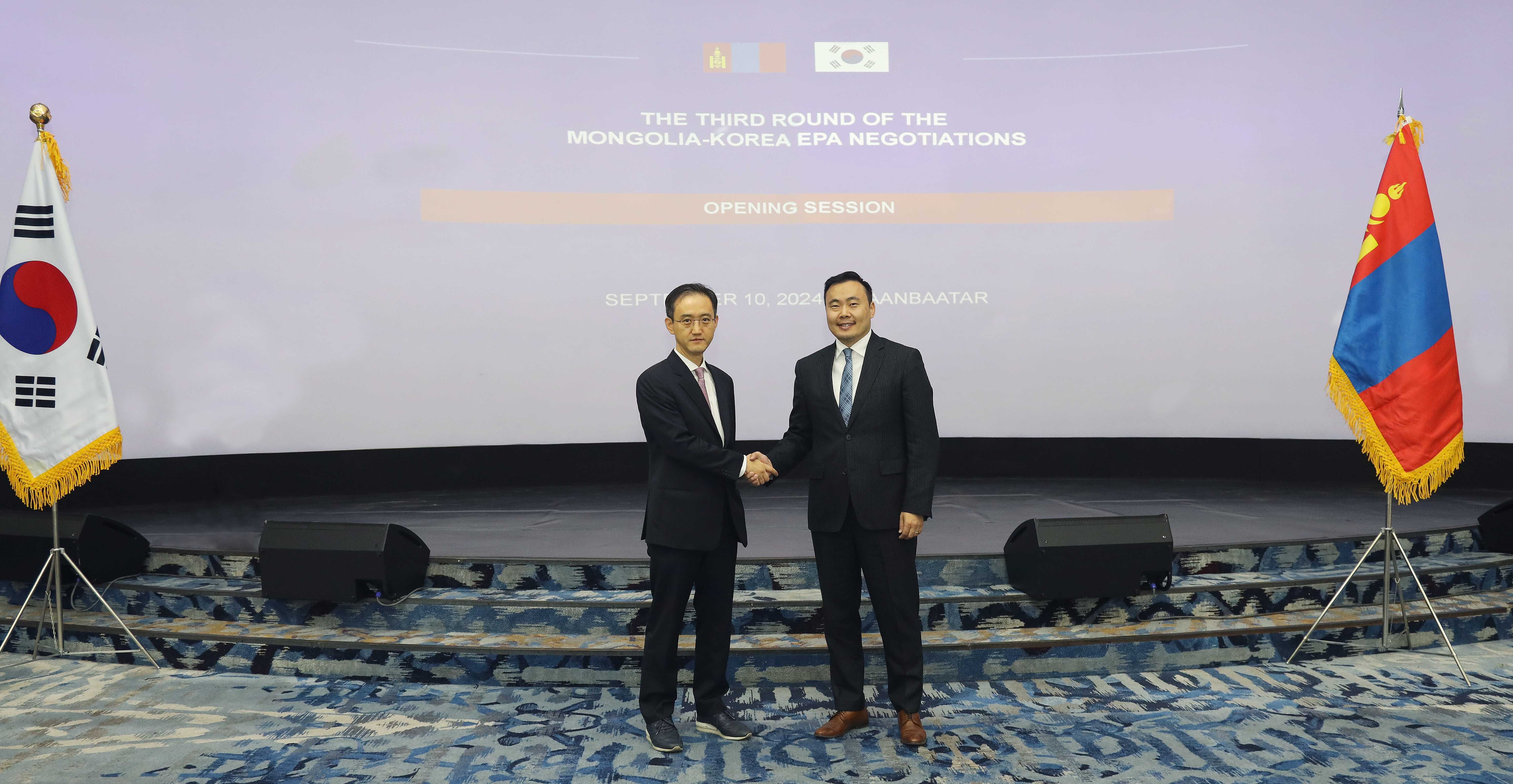 Korea’s Director General for FTA Negotiations Peob-min Ryu is leading the government delegation in the third round of official negotiations for the Korea-Mongolia Economic Partnership Agreement (EPA) through September 10–13 in Ulaanbaatar, Mongolia. The Mongolian delegation is headed by State Secretary for the Ministry of Economy and Development Batkhuu Idesh. Director General Ryu gave opening remarks and engaged in negotiations on goods, rules of origin, services, investment, digital, finance, government procurement, and intellectual property. date2024-09-11