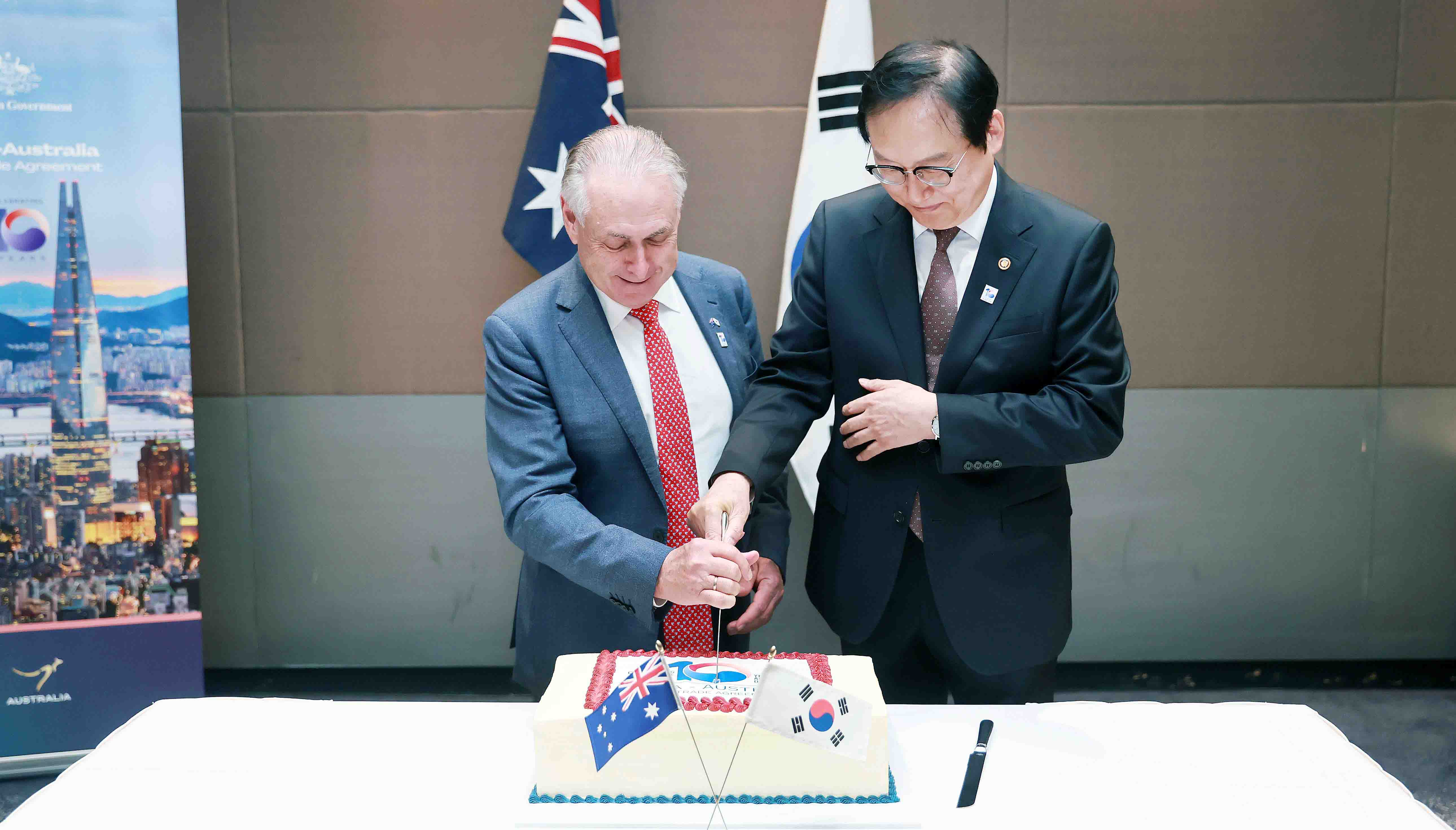 Minister for Trade Inkyo Cheong attended the 10th Anniversary Commemoration Ceremony of the Korea-Australia FTA on September 3 in Perth with Australia’s Trade and Tourism Minister Don Farrell, Minister for Infrastructure, Transport, Regional Development and Local Government Catherine King and other relevant representatives and gave a congratulatory message and took part in the cake cutting ceremony. date2024-09-03