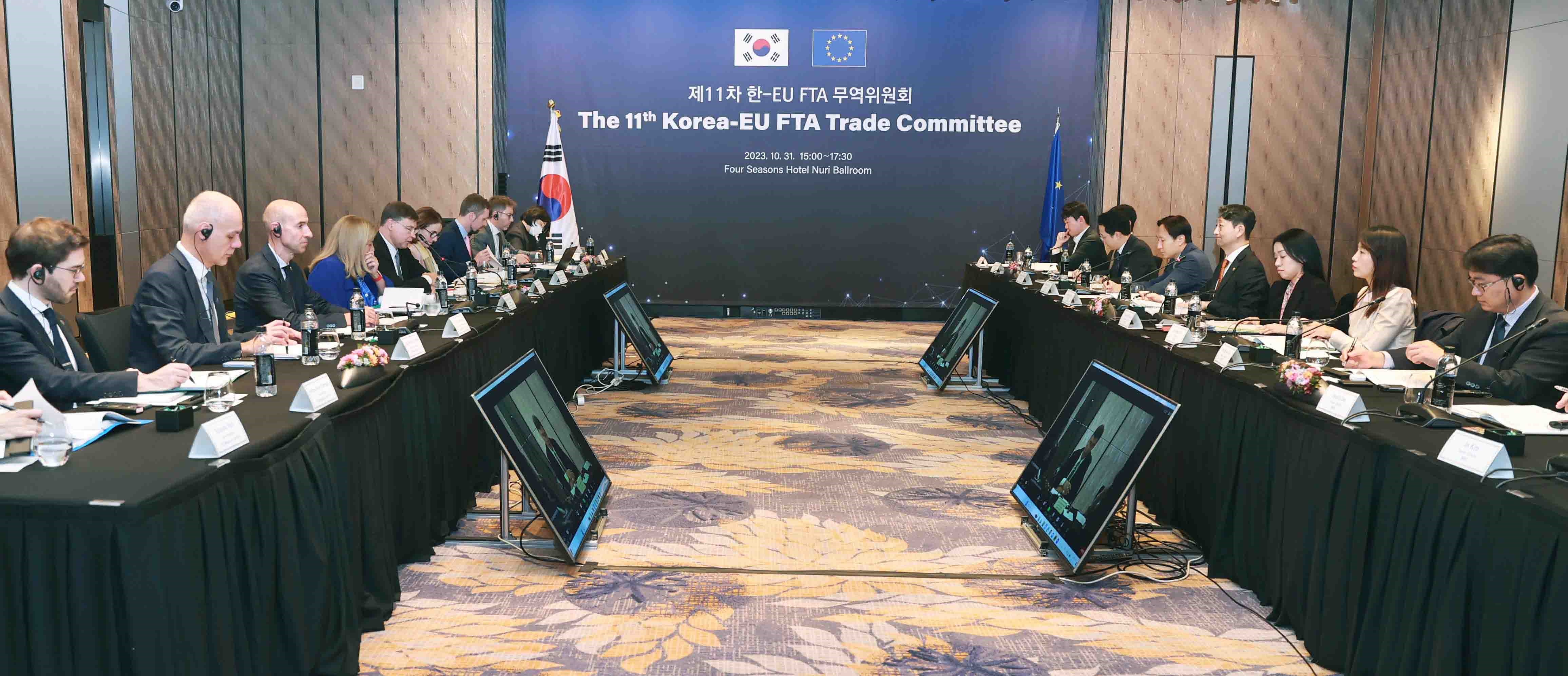 Minister for Trade Dukgeun Ahn and European Commission Executive Vice-President Valdis Dombrovskis chaired the 11th Korea-EU Free Trade Agreement (FTA) Trade Committee Meeting on October 31 in Seoul to assess the FTA implementation progress and discuss trade issues, including the EU's Carbon Border Adjustment Mechanism (CBAM). In presiding the 11th Korea-EU FTA Trade Committee meeting, the trade chiefs of Korea and the EU assessed the FTA implementation progress and agreed to expand free trade date2023-11-02