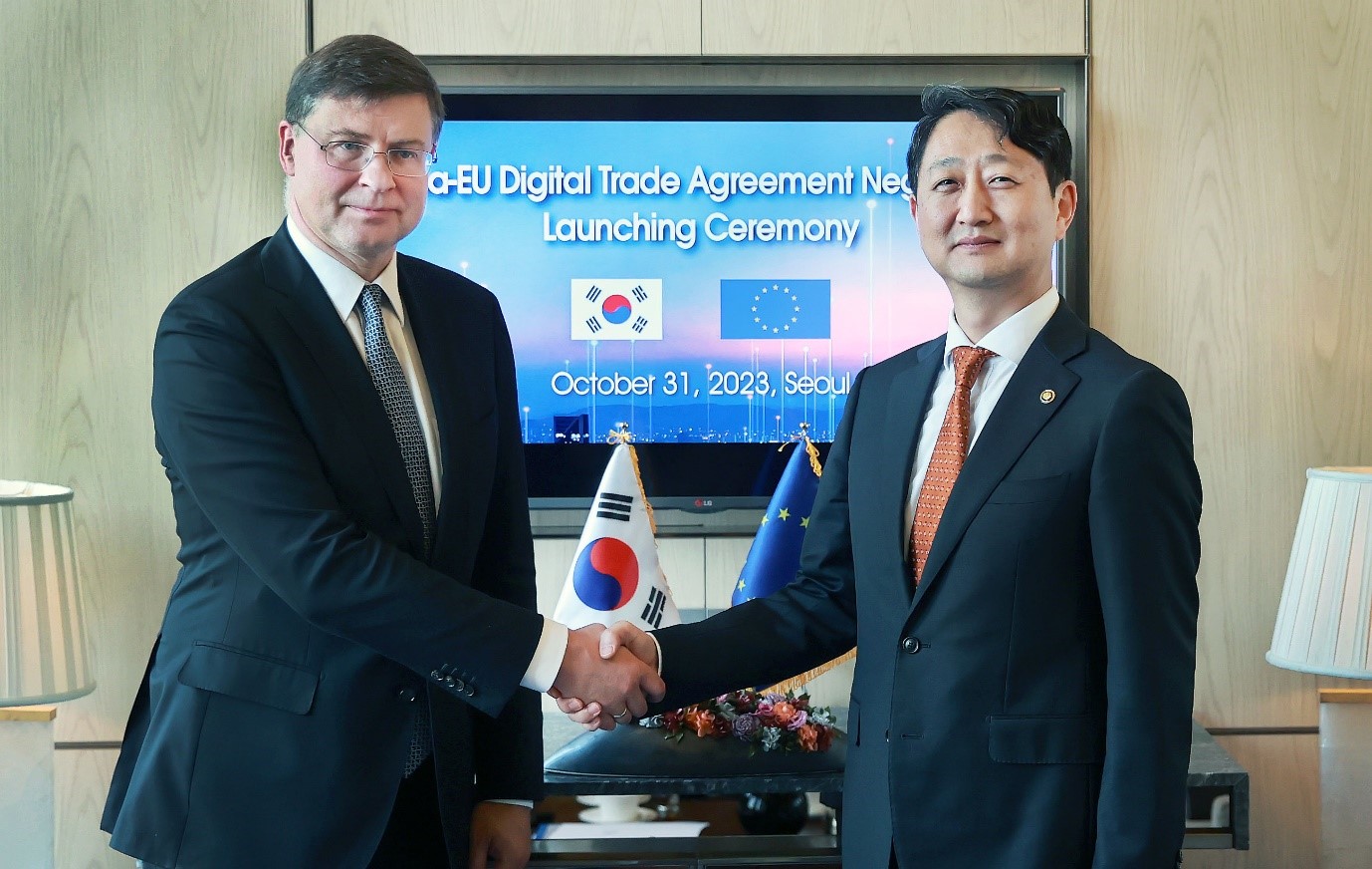 Minister for Trade Dukgeun Ahn and European Commission Executive Vice-President Valdis Dombrovskis issued a joint statement on October 31 in Seoul announcing the launch of the Korea-EU Digital Trade Agreement negotiations, on the occasion of the Korea-EU Free Trade Agreement (FTA) Trade Committee meeting held on the same day. It is anticipated that the beginning of negotiations for a digital trade agreement with EU, Korea’s third largest trade partner and the world’s third largest economy (in terms of GDP), will spur e-commerce and data businesses of both sides while also establishing the basis for cooperation in new digital technologies. The Ministry of Trade, Industry and Energy (MOTIE) has been strategically pushing the expansion of the digital trade network as part of its digital trade policy, sealing thus far digital trade agreements with Singapore, Chile and New Zealand. The Korea-EU Digital Trade Agreement will expand the scope of the digital trade network to the EU region as well, one of Korea’s digital innovation partners. Moreover, the agreement will contribute to fostering a reliable, open and fair digital trade environment for both corporations and consumers engaging in digital trade, while also strengthening the Korea-EU digital trade partnership through increased business opportunities for their companies, including SMEs, by heightening their competitiveness in the global digital economy. Trade Minister Ahn remarked that he welcomes the commencement of the Korea-EU Digital Trade Agreement negotiations, and requested that both sides take the lead in the global dialogue on digital trade rules in accordance with the high standards of trade rules based on the Korea-EU digital trade principles signed in November 2022. The joint statement is as follows: Joint Statement on the Launch of Negotiations for a Korea-EU Digital Trade Agreement Joint statement by Korean Minister for Trade Dukgeun Ahn and European Commission Executive Vice-President Valdis Dombrovskis on the launch of negotiations on a Korea-EU Digital Trade Agreement. Today, in the margins of the 11th Korea-EU Trade Committee, we agreed to launch negotiations between the Korea and EU on a Digital Trade Agreement that will provide legal certainty for businesses and consumers engaged in digital trade, enhance their protection in digital transactions, and foster open, free and fair online environment. The Korea and EU share long-standing and robust economic relations underpinned since 2011 by the Korea-EU Free Trade Agreement. With these negotiations, we aim to bring this partnership into the digital domain. It demonstrates our commitment to being at the forefront of new developments in the digital economy, countering digital protectionism, and playing a leading role in setting digital trade rules which are future-proofed as well as responsive to innovation and emerging technologies. Building on the cooperation and convergence shown by our Digital Trade Principles, Korea and EU intend to negotiate an ambitious and modern digital trade agreement that contributes to our societies’ digital transformation, corresponds to the fast-evolving nature of the digital economy, and builds on and complements our existing preferential trade framework. The Korea and EU consider that digital trade is an essential part of the digital and green transitions of our societies. It entails a further deepening our trade relations, supports job creation and empowers companies to participate in the global economy, notably micro, small, and medium-sized enterprises. It also responds to online consumer needs and fosters innovation. Our digital trade rules should build consumer trust, ensure predictability and legal certainty for businesses, remove and prevent the emergence of unjustified barriers to digital trade, and facilita date2023-11-03