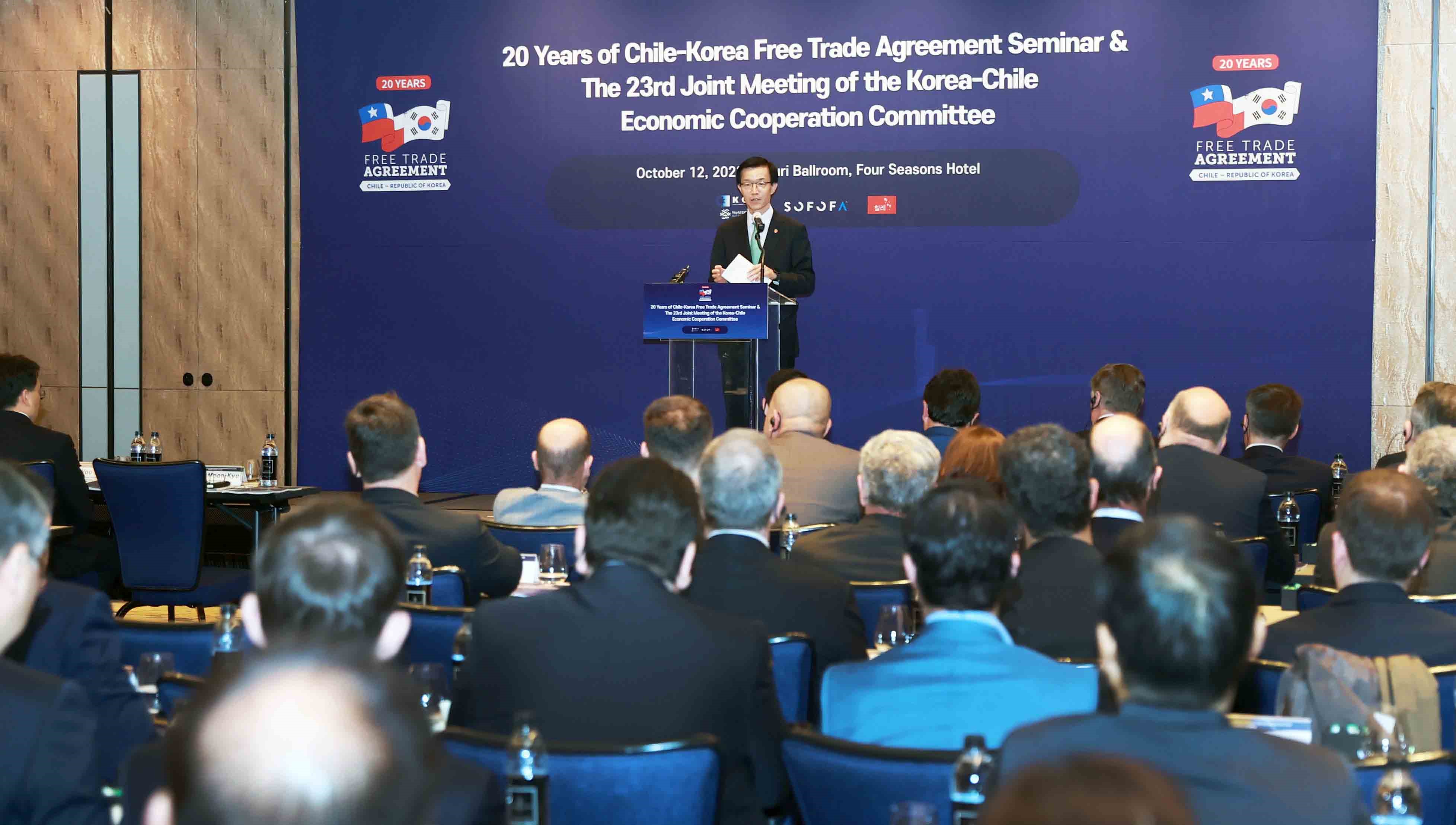 Trade, Industry and Energy Minister Bang Moon Kyu attended the 23rd Korea-Chile Economic Cooperation Committee meeting on October 12 in Seoul, held in commemoration of the two countries’ 20th anniversary of signing the Korea-Chile free trade agreement (FTA). In his congratulatory message, the minister encouraged those present to 'make further effort for the forward-looing development of Korea-Chile bilateral relations.” Approximately 100 persons attended the event, date2023-10-13