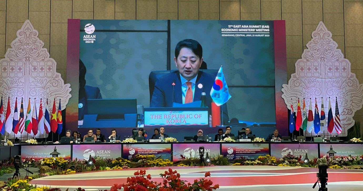 The Republic of Korea’s Minister for Trade Dukgeun Ahn attended the 11th East Asia Summit Economic Ministers’ Meeting on August 21 held in Semarang, Indonesia, to discuss recent global economic developments, supply chain stabilization, climate change response, digital transition and restoration of multilateral trade system. Trade Minister Ahn also attended the following Regional Comprehensive Economic Partnership (RCEP) ministerial meeting to discuss support organization iss date2023-08-23