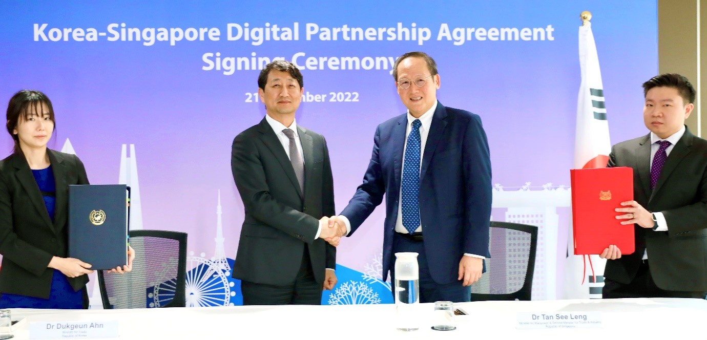 Minister for Trade Dukgeun Ahn met with Singapore’s Second Minister for Trade and Industry Tan See Leng in Singapore on November 21 and signed the Korea-Singapore Digital Partnership Agreement (KSDPA), concluding the negotiation procedures for the KSDPA, which was first settled in December 2021, and was followed by a legal examination and deliberation process. date2022-11-23