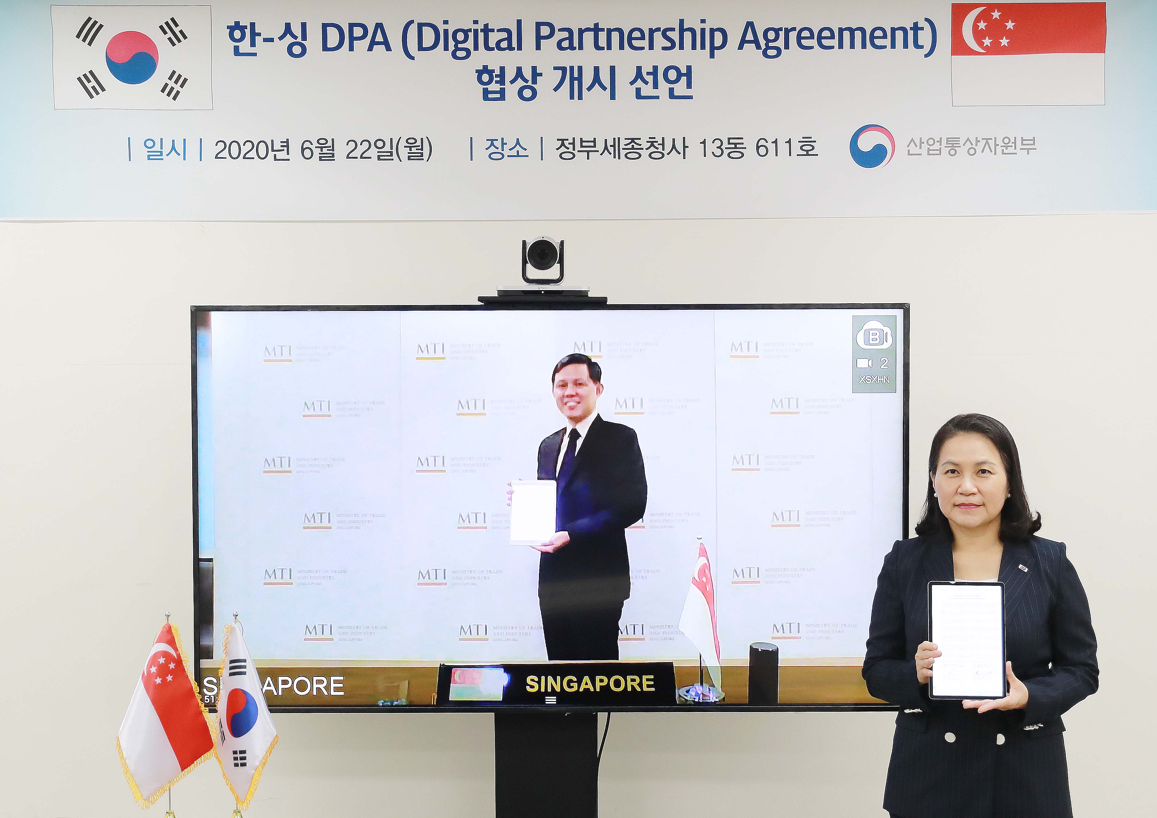 Trade Minister Yoo Myung-hee (right) talked with her Singaporean counterpart Chan Chun Sing via videoconference on June 22, to start negotiations on the Korea-Singapore Digital Partnership Agreement (KSDPA), the first digital trade deal for Korea. Trade Minister Yoo said that the agreement is expected to help ease digital trade barriers between the two countries and enhance global competitiveness of new technology-based Korean firms. The first official round of negotiations wil date2020-06-23