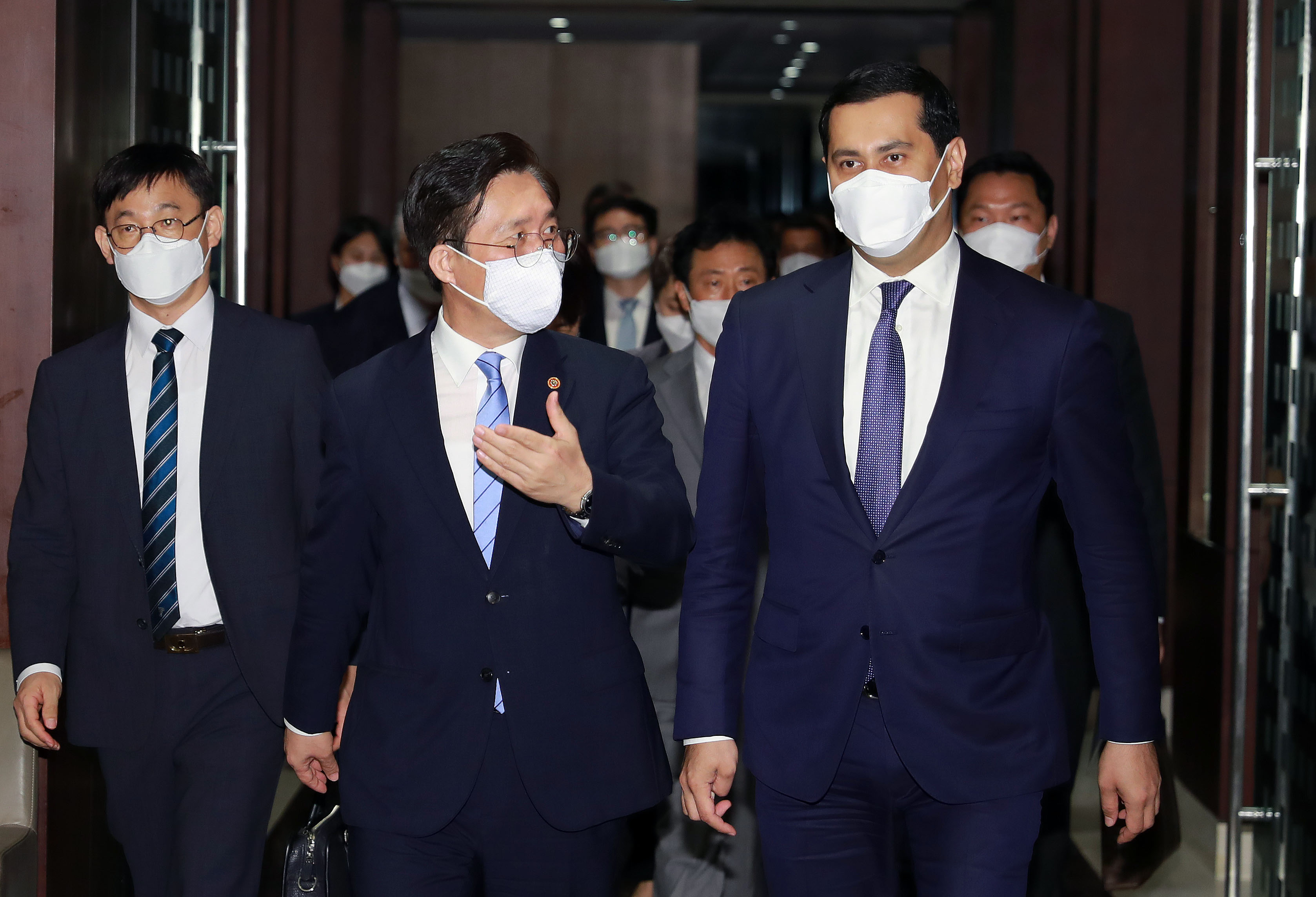 Trade, Industry and Energy Minister Sung Yun-mo (left) met with Uzbekistan’s deputy prime minister for investments and foreign economic affairs, Sardor Umurzakov, in Seoul on July 6. At the first ministerial meeting held face-to-face since the coronavirus outbreak, the two countries discussed ways to expand bilateral economic cooperation in various industries and agreed to proceed with preparations for the Korea-Uzbek free trade agreement (FTA) negotiations. date2020-07-07