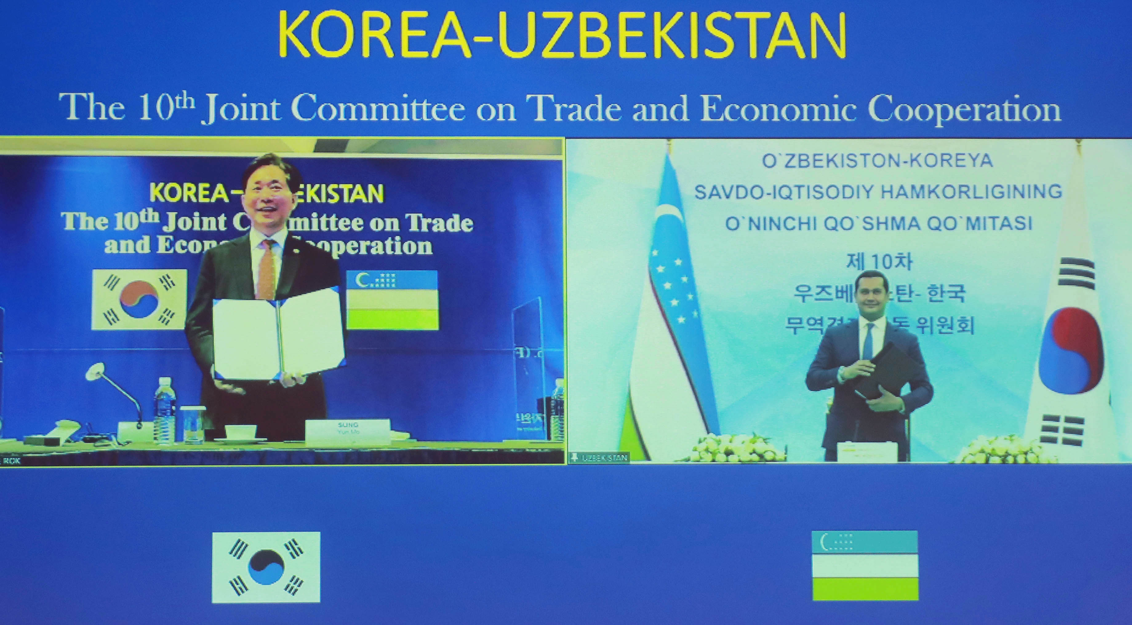 Trade, Industry and Energy Minister Sung Yun-mo met with Uzbek deputy prime minister for investments and foreign trade Sardor Umurzakov virtually at the 10th Joint Committee on Trade and Economic Cooperation between Korea and Uzbekistan on November 6, to call for bilateral trade talks and expanded digital cooperation. date2020-11-06