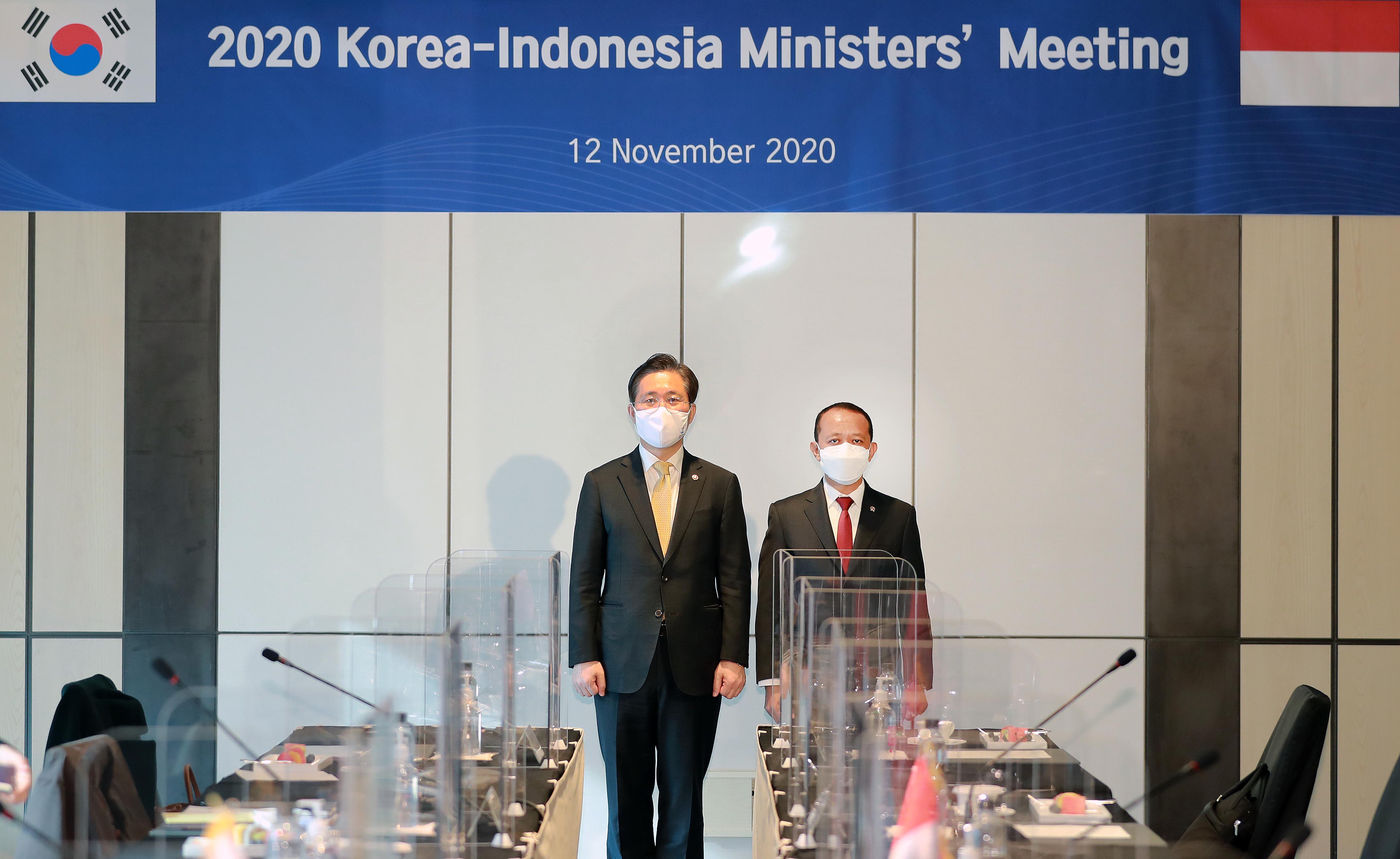 Trade, Industry and Energy Minister Sung Yun-mo (left) met with his Indonesian counterpart Bahlil Lahadalia in Seoul on November 12, to discuss ways to expand investment and industrial cooperation between the two nations. Minister Sung also requested that the two countries work together to overcome the difficult economic situation presented by COVID-19 and ensure smooth business activities by more than 2,000 Korean companies in steel, petrochemical, automobile, and textile industries operating i date2020-11-12