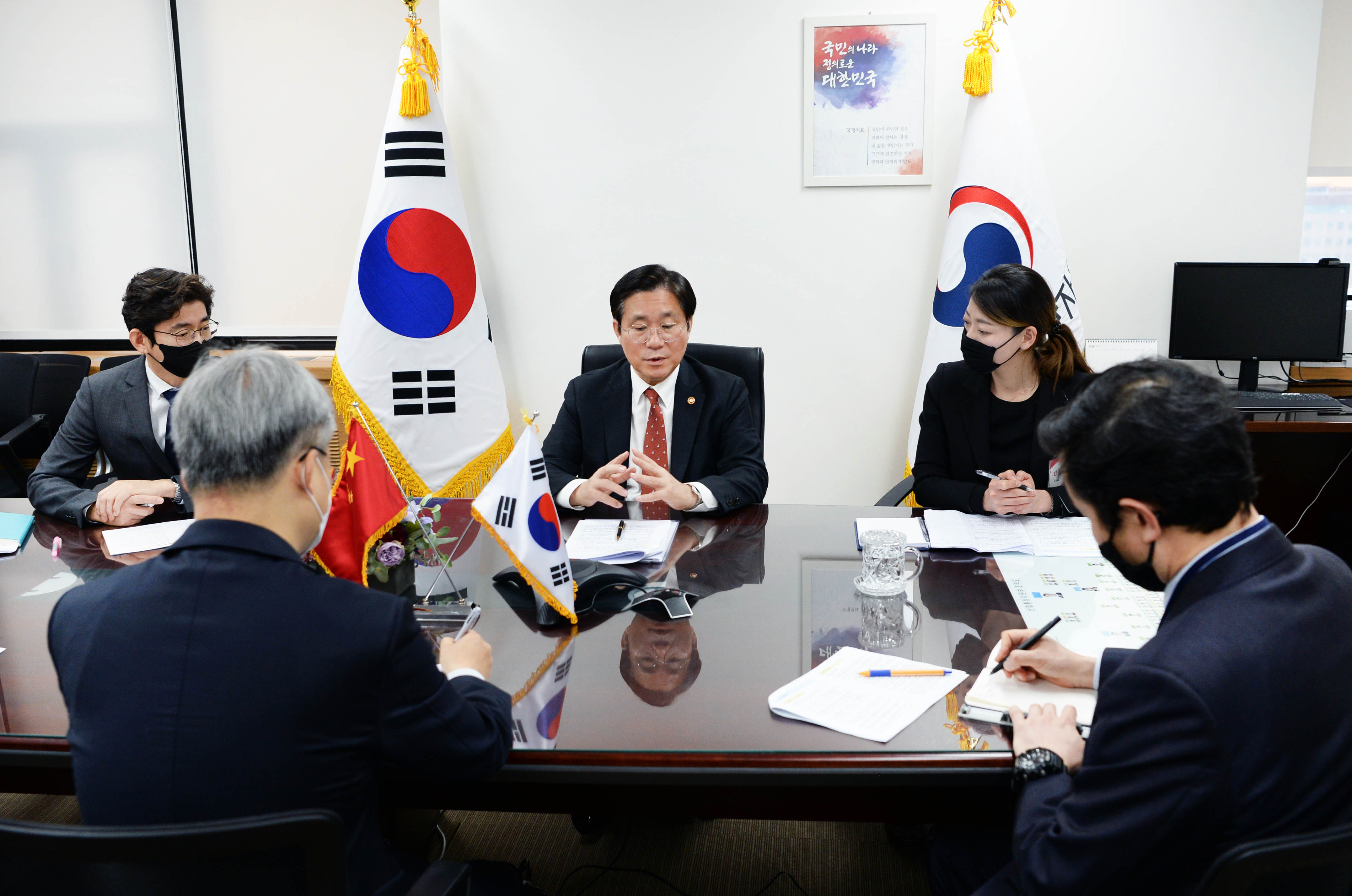 Trade, Industry and Energy Minister Sung Yun-mo (center) talked with his Chinese counterpart Zhong Shan via teleconference on April 17, to discuss ways to expand bilateral cooperation as a follow-up to the ASEAN+3 Special Summit held on April 14. Minister Sung proposed that the two countries work together to allow businesspeople make essential trips across borders. The two countries also agreed to work toward signing the Regional Comprehensive Economic Partnership (RCEP) agreement withi date2020-04-17