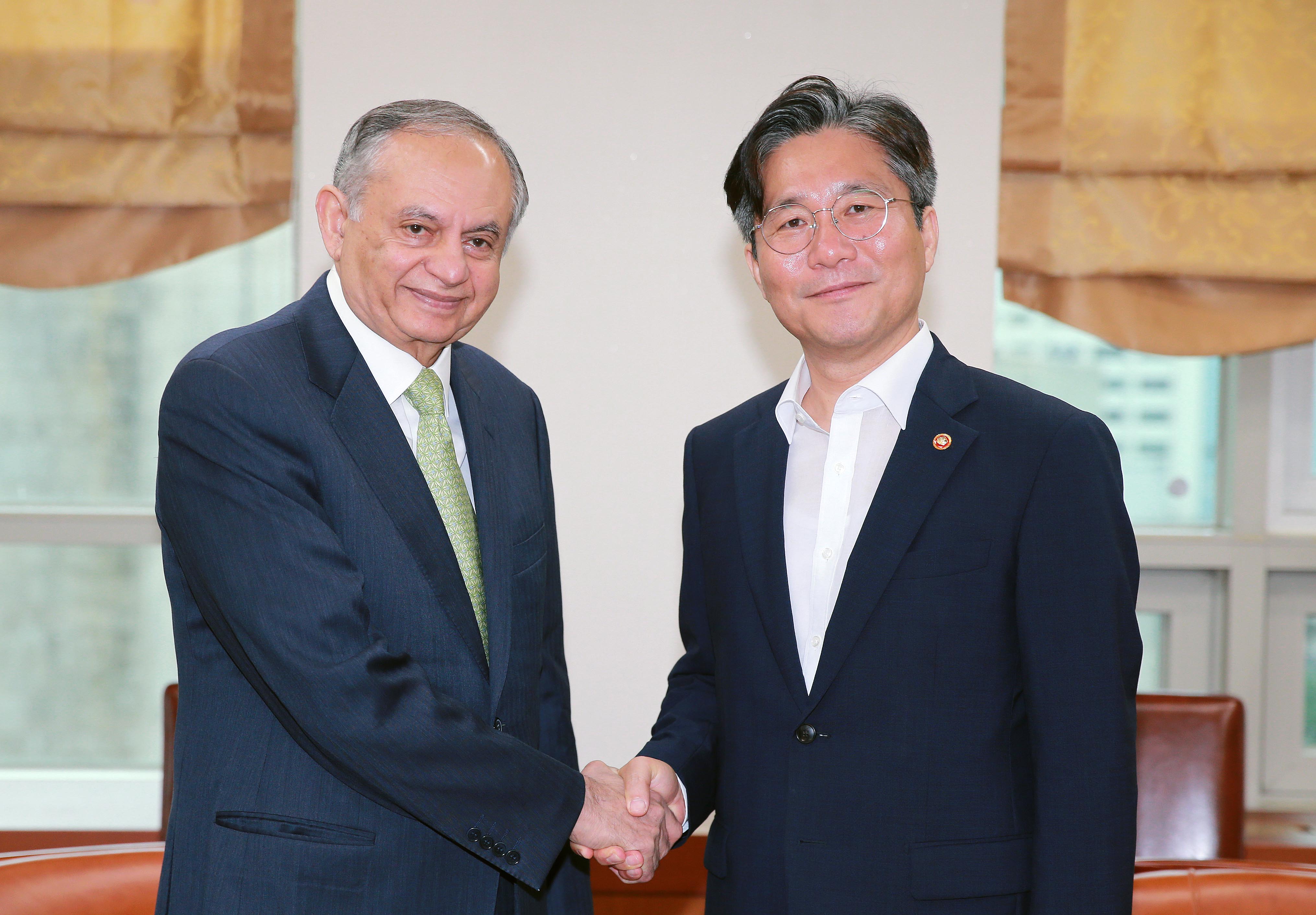 Trade, Industry and Energy Minister Sung Yun-mo (right) had a meeting with Pakistan's Adviser to Prime Minister on Commerce, Textile, Industries and Investment Abdul Razak Dawood in Seoul on August 1. Minister Sung and Adviser Dawood discussed ways to promote investment between the two countries and expand bilateral cooperation in the fields of infrastructure construction. date2019-08-01