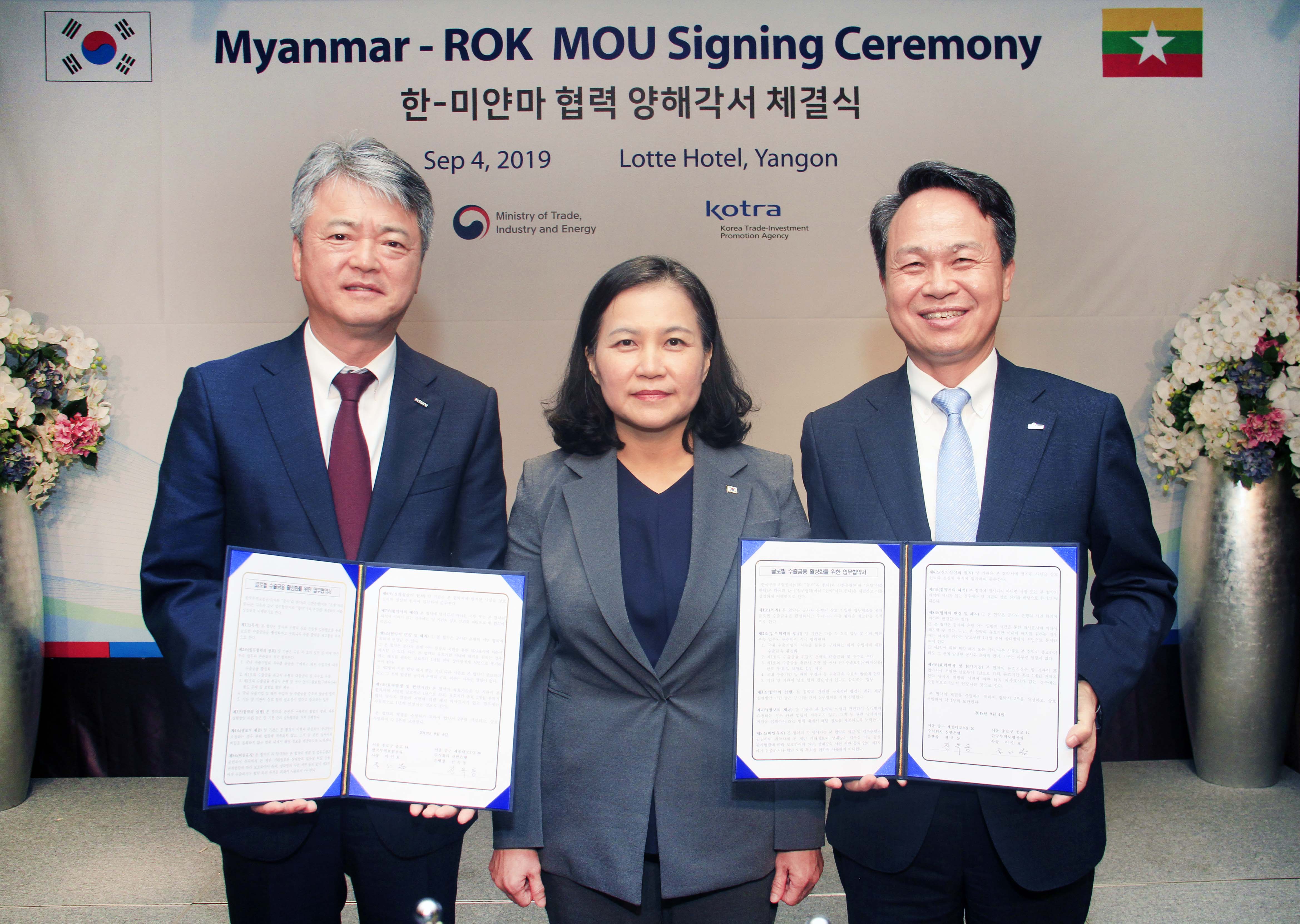Trade Minister Yoo Myung-hee (center) attended the Myanmar-ROK MOU Signing Ceremony for economic and infrastructure development held in Yangon on September 4. The agreements will bolster cooperation in various industries between the two countries and provide an opportunity for Korean companies to expand their export markets. date2019-09-05