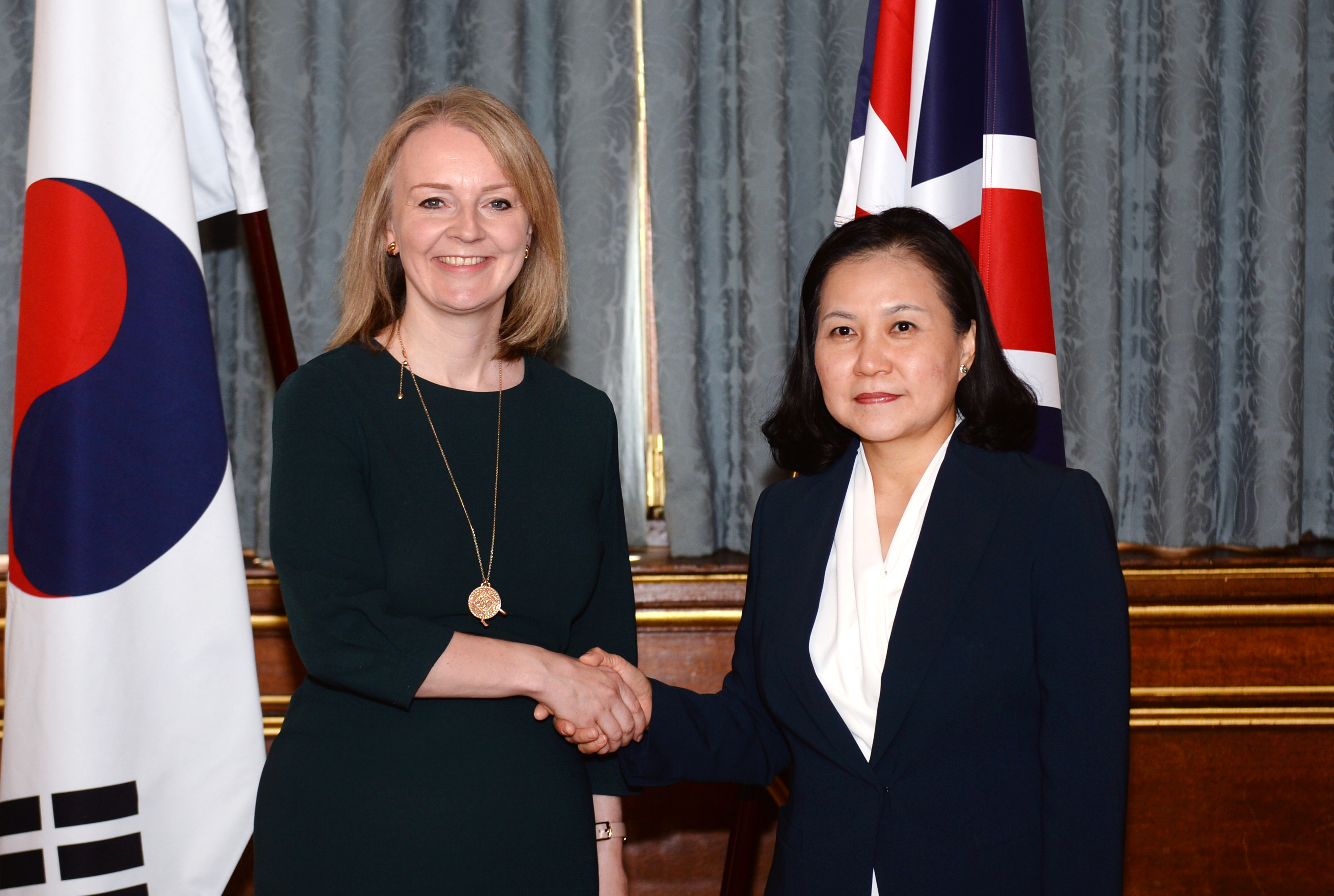 Trade Minister Yoo Myung-hee (right) signed a continuity FTA with the UK’s Secretary of State for International Trade Elizabeth Truss in London, Aug 22. The agreement focuses on maintaining the bilateral trade relations at the same level as the existing Korea-EU FTA, allowing businesses to trade freely in the event of a no-deal Brexit. date2019-08-23