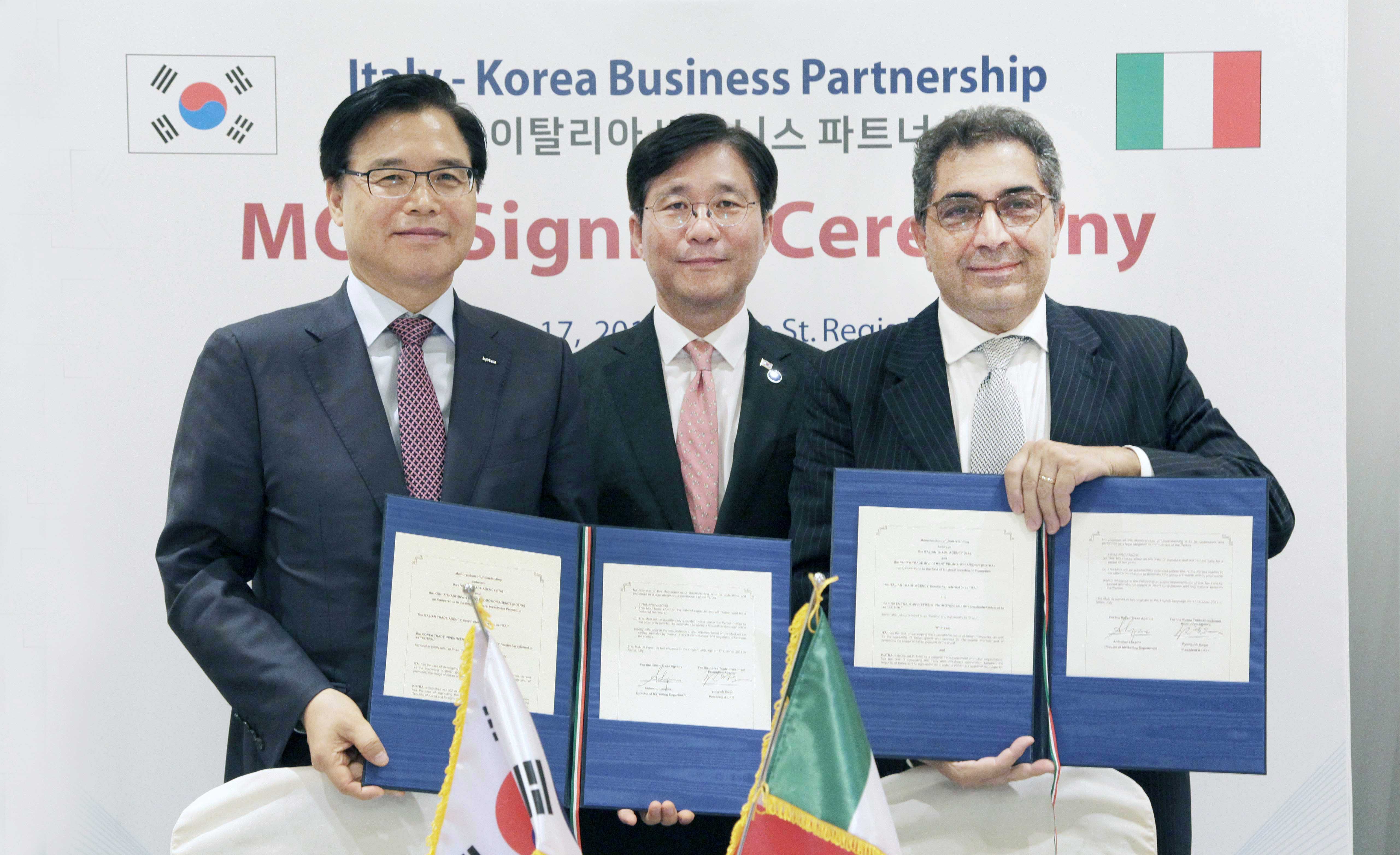 Trade, Industry and Energy Minister Sung Yunmo (center) attended the memorandum of understanding (MOU) signing ceremony held at the Korea-Italy Business Networking Seminar in Rome, Italy, on October 17.At the event, the Korea Trade-Investment Promotion Agency (KOTRA) and the Italian Trade Agency (ITA) signed an MOU for investment cooperation between the two countries. KOTRA also inked an MOU with Istituo Marangoni for the advancement of fashion design.During the ceremony, Minister Sung delivered date2018-10-18