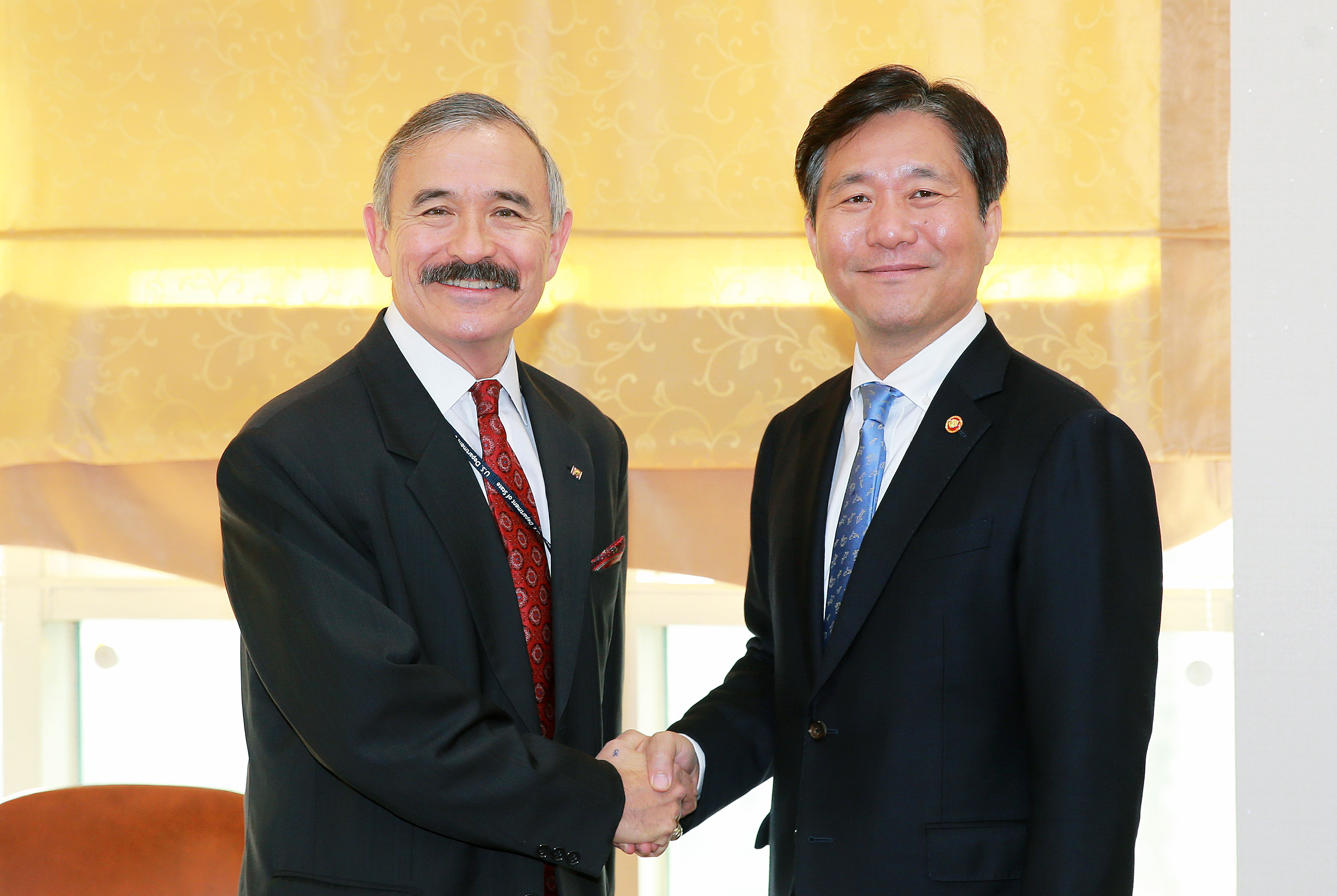 Minister of Trade, Industry and Energy Sung Yunmo (right) met with U.S. Ambassador to Korea Harry B. Harris at the Government Complex Seoul on November 16.During the meeting, Minister Sung and Ambassador Harris discussed bilateral cooperation between the two countries on economy, trade, and energy. date2018-11-16