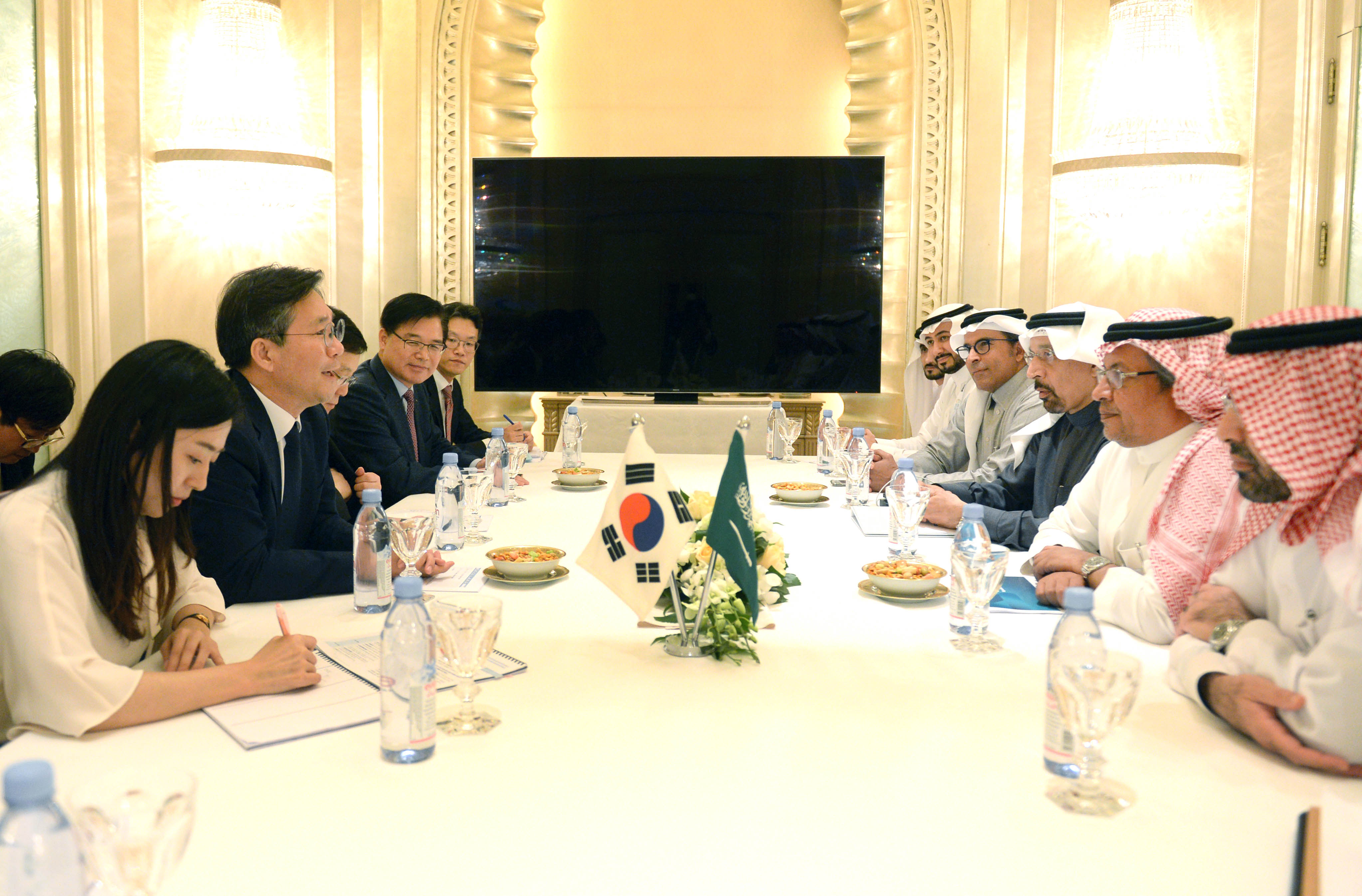 Trade, Industry and Energy Minister Sung Yun-mo (second from the left) had a meeting with Saudi Arabia’s Energy Minister Khalid A. Al-Falih (third from the right) and Saudi Economy Minister Mohammed Al-Tuwaijri (second from the right) in the UAE on January 14 (local time).During the ministerial talk, the top officials discussed key issues involving bilateral cooperation in industry and energy, as well as the Korea-Saudi Vision 2030.The ministers agreed to hold the second meeting of the Kor date2019-01-15