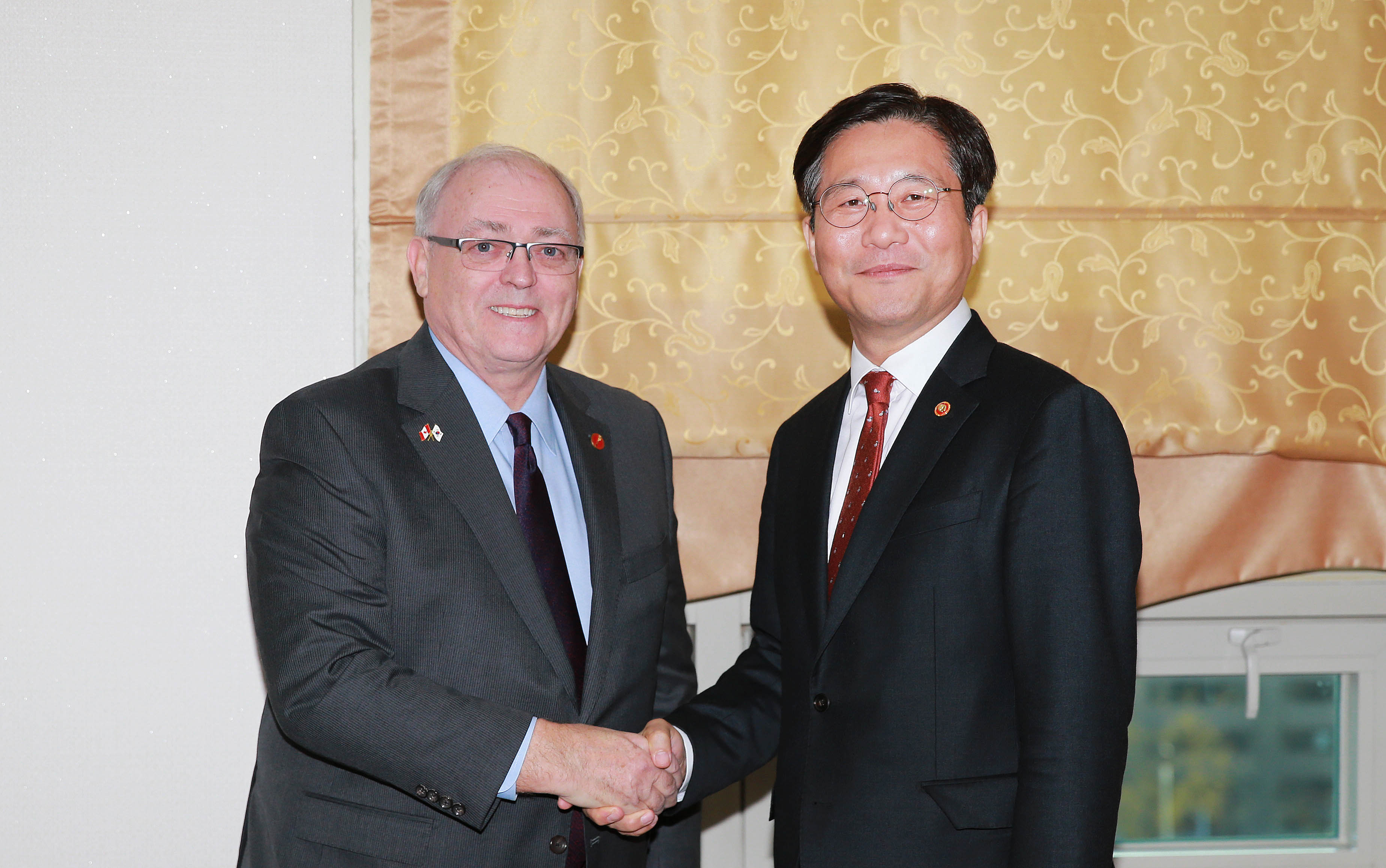 Trade, Industry and Energy Minister Sung Yunmo (right) met with Canadian Senate Speaker George Furey for a discussion at the Government Complex Seoul on November 12.The meeting was also attended by Canadian Senators Grant Mitchell, Yonah Martin, and Sarabjit S. Marwah, as well as Canadian Ambassador-designate to Korea Michael Danagher. date2018-11-12