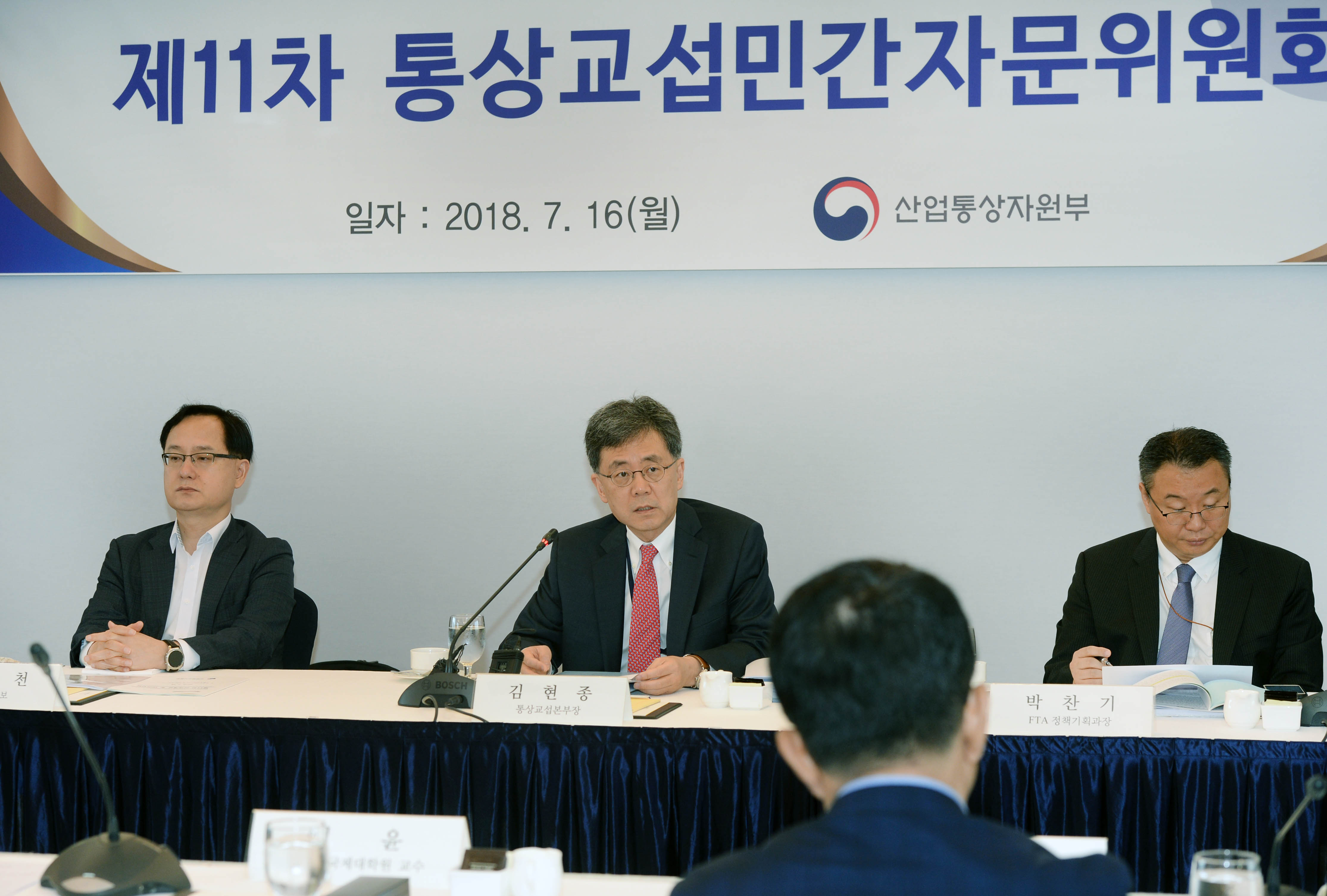 Trade Minister Kim Hyun-chong (center) hosted a meeting with advisors for trade issues in the private sector to discuss a strategic approach to key trade issues facing Korea in Seoul on July 16. Key issues brought to the table ranged from the government’s response to the U.S.-China trade tensions to the U.S. Section 232 probe into imports of autos and auto parts. Advisors in the meeting included Kim jun-dong, Vice Chairman of the Korea Chamber of Commerce and Industry, Ha date2018-07-16