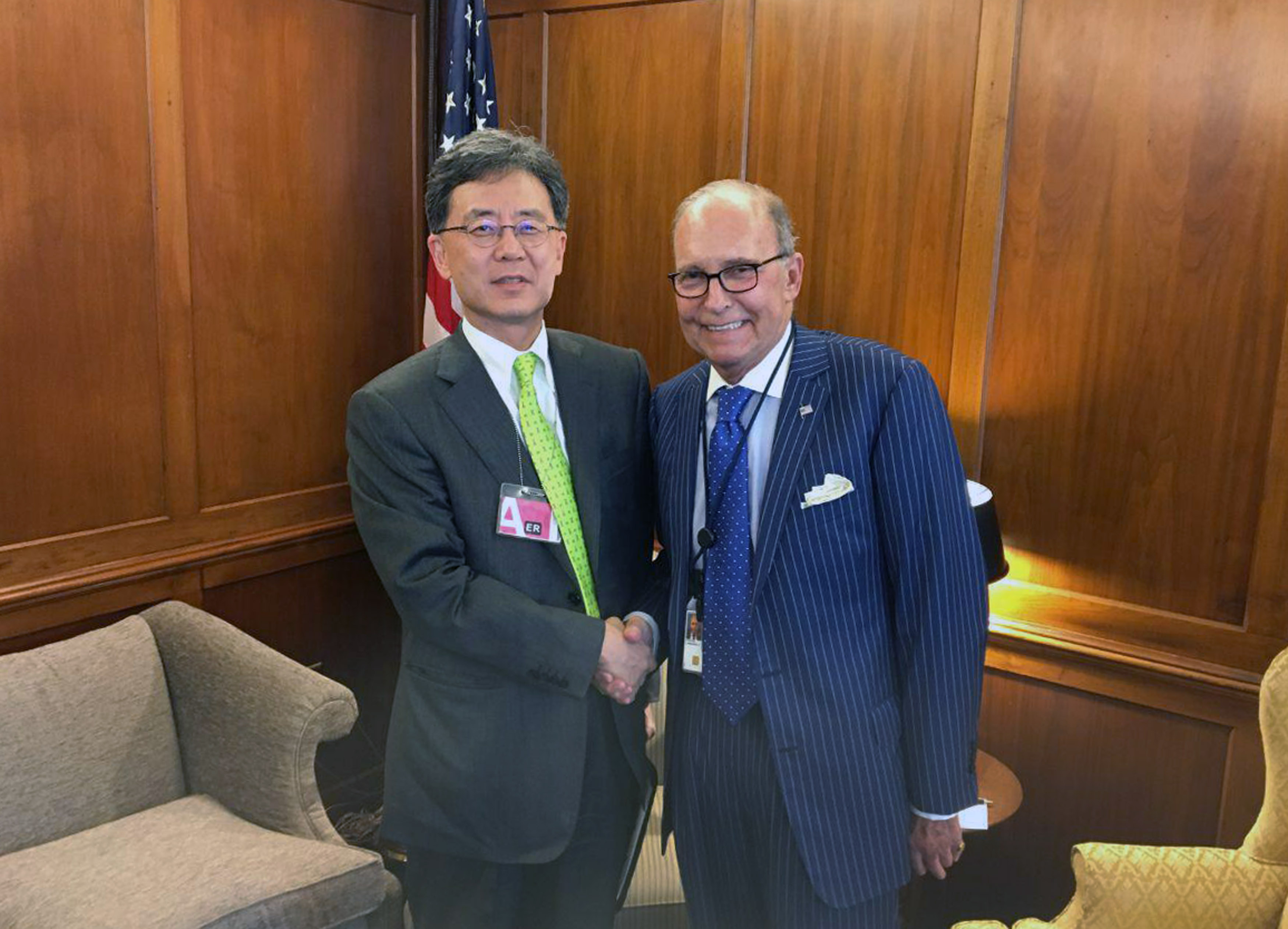 Trade Minister Kim Hyun-chong (left) met Larry Kudlow, Director of the U.S. National Economic Council (NEC), in Washington on July 20 and called on the U.S. government to exempt tariffs on the imports of Korean cars and car parts. The Minister explained to the White House economic advisor that Korea should not be subject to the Section 232 tariffs on imported autos and auto parts. He said that the country has never posed a threat to the U.S. national security as its key ally and has rem date2018-07-21