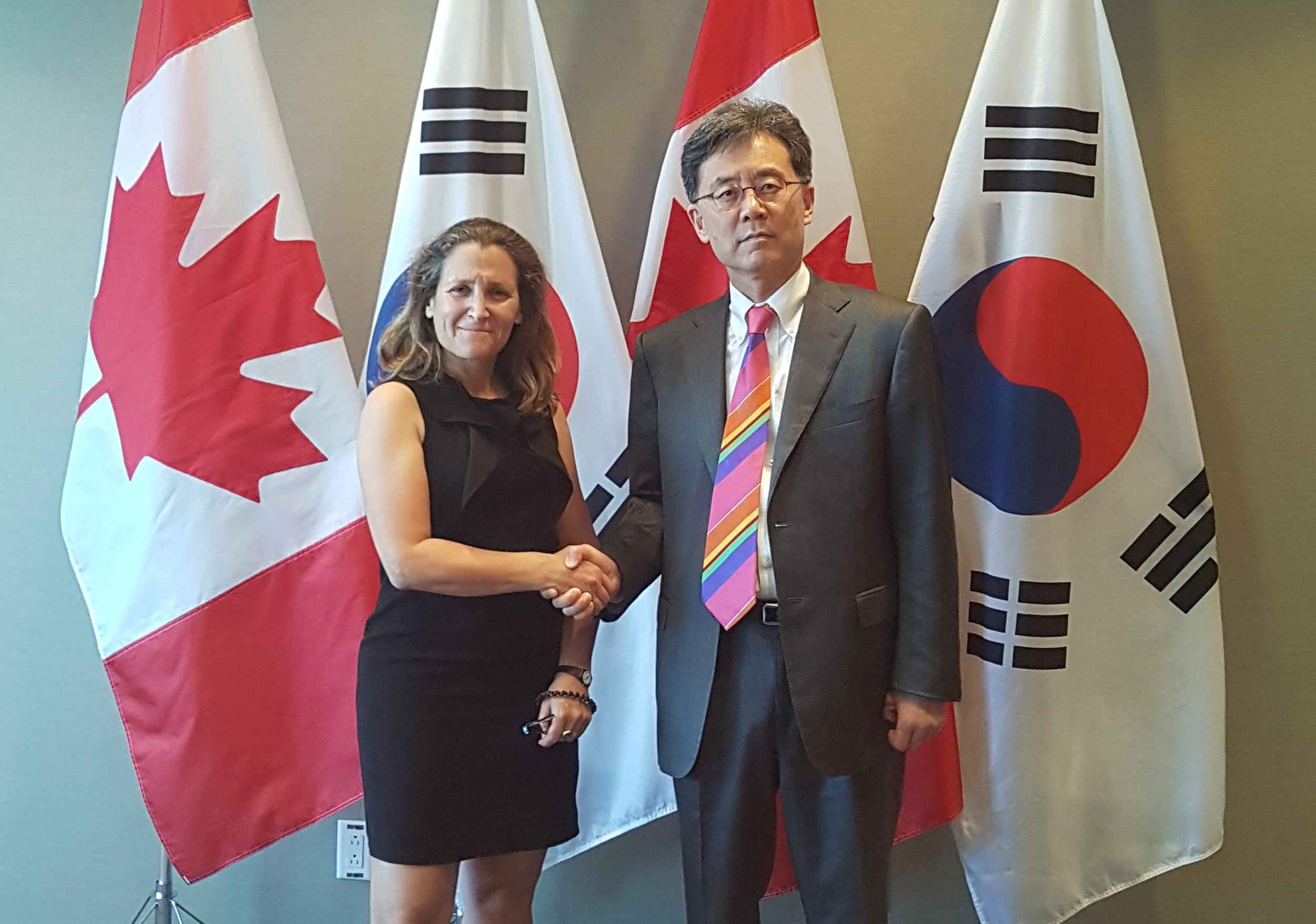 Trade Minister Kim Hyun-chong (right) and Canadian Minister of Foreign Affairs Chrystia Freeland discussed ways to cooperate against the U.S. Section 232 investigations into auto and auto parts imports in Canada on July 18. Both Ministers agreed that the two countries, both of which are allied with the U.S. and have a trade pact with the U.S., should be exempted from possible new security-based tariffs. In addition, the officials underlined the need for joint actions against grow date2018-07-19