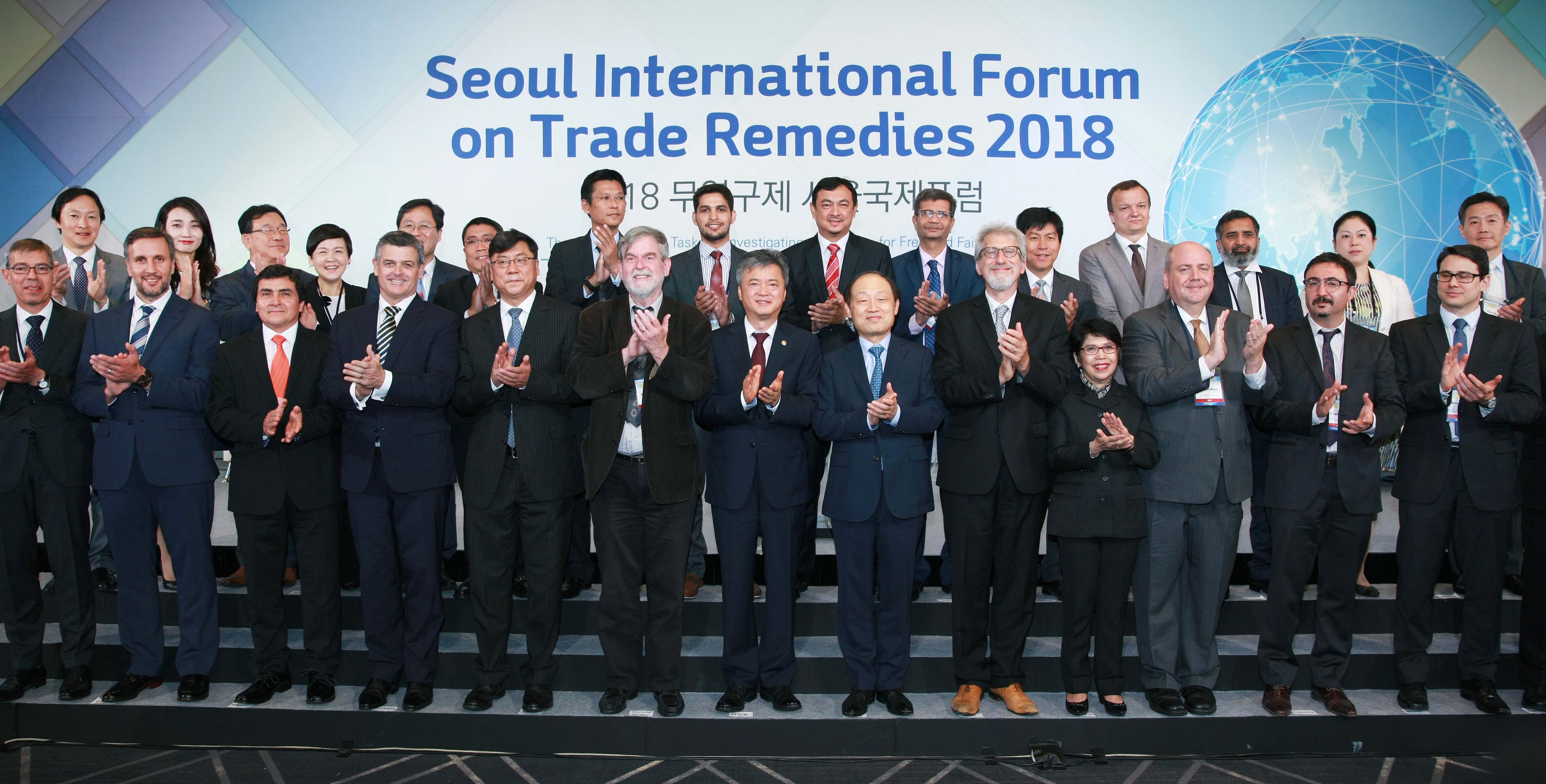 Vice Minister of Trade, Industry and Energy Lee In-ho (seventh from left, front row) gave the congratulatory remarks at the Seoul International Forum on Trade Remedies 2018 in Seoul on July 3. Saying that the free trade system has contributed to growth and made our lives considerably better, Vice Minister Lee called for fair and transparent remedies that abide by WTO rules and told the trade remedy authorities that they should reduce uncertainties in order to overcome protectionis date2018-07-03