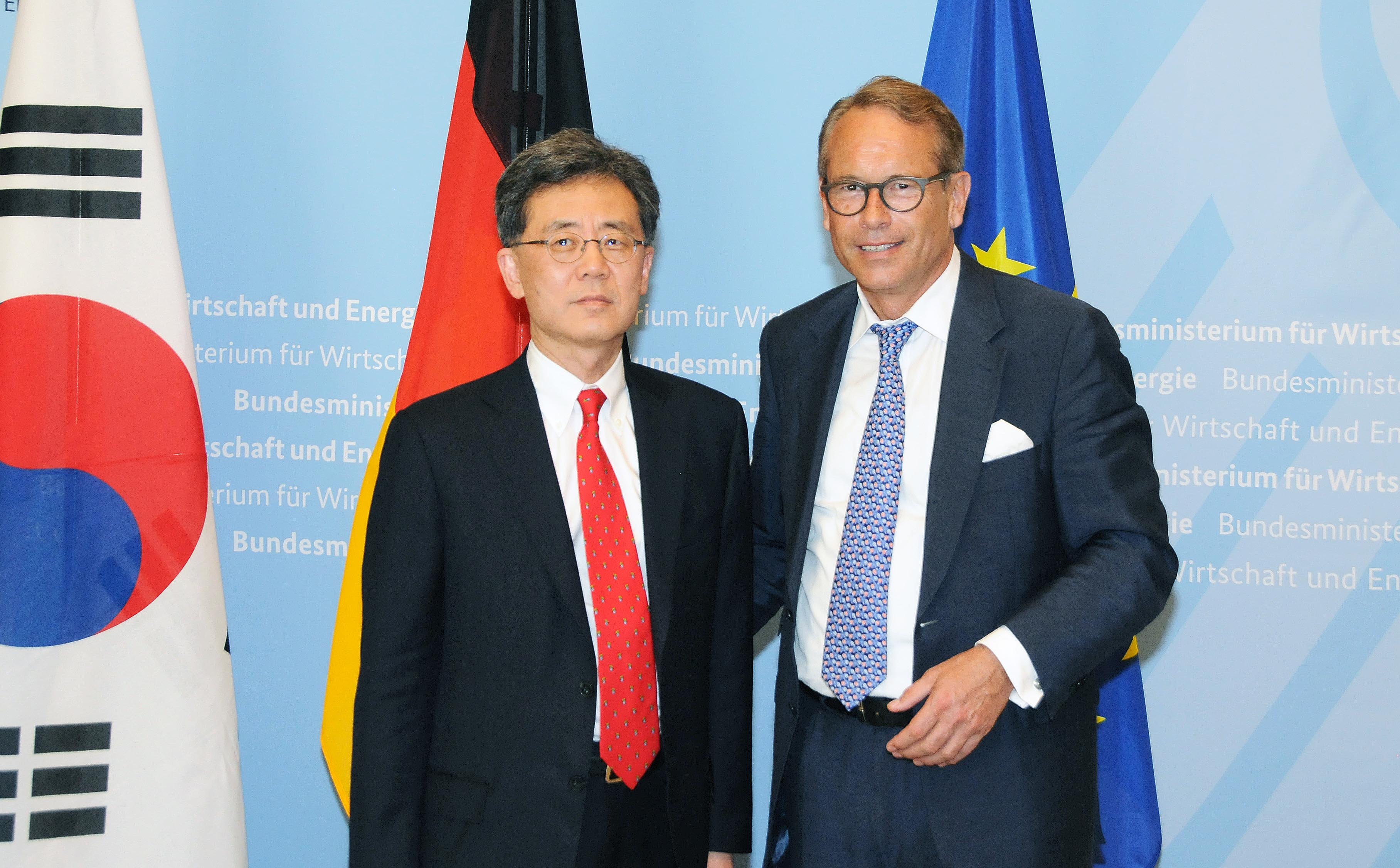 Trade Minister Kim Hyon-chong (left) met German State Secretary Ulrich Nussbaum at the Federal Ministry for Economic Affairs and Energy to discuss trade issues between the two nations in Germany, on May 28. During the meeting, Trade Minister Kim outlined Korea’s views on the safeguard investigation currently being undertaken by the EU into imported steel products, and discussed other trade-related issues, such as the U.S. steel tariffs based on Section 232 of the Trade Expan date2018-05-30
