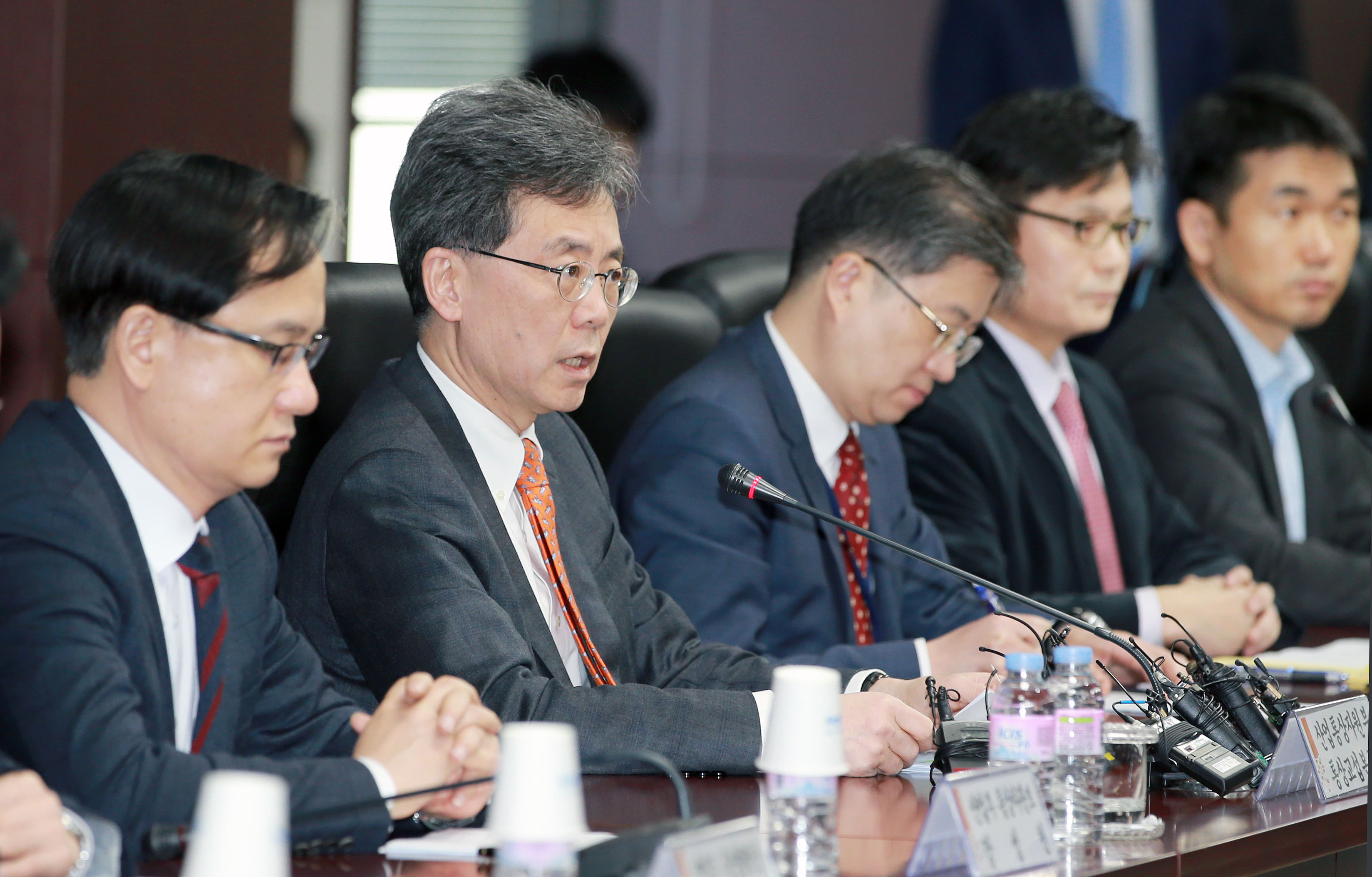Trade Minister Kim Hyun-chong (second from left) chaired a meeting with corporate leaders from Korean washing machine and solar makers to discuss measures against new U.S. tariffs on imported washers and solar panels in Seoul on January 23. According to an announcement made by the Office of the U.S. Trade Representative (USTR) on January 22 (local time), President Donald Trump approved tariffs on imported large residential washers as well as imported solar cells and modules. This suggests date2018-01-23