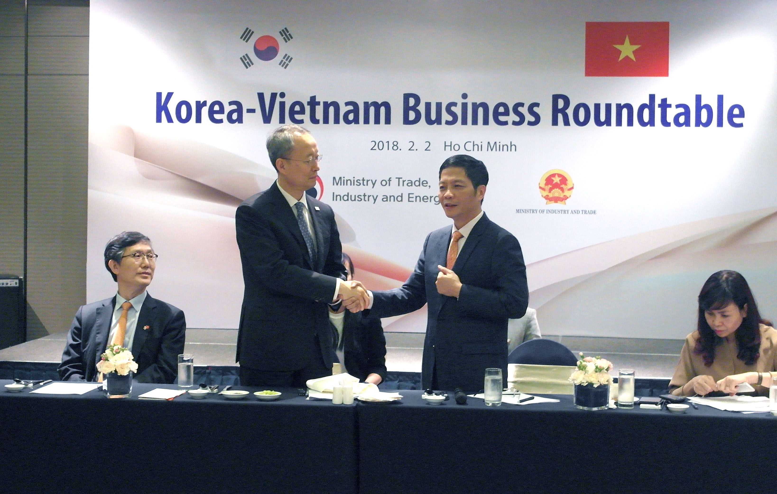 Trade, Industry and Energy Minister Paik Ungyu (second from left) shook hands with Vietnam’s Industry and Trade Minister Tran Tuan Anh (second from right) at the Korea-Vietnam Business Roundtable at a hotel in Ho Chi Minh City on February 2.After delivering his opening remarks at the meeting, Minister Paik discussed ways to support Korean companies in Vietnam and address their challenges through policies of the Korean and Vietnamese governments.The roundtable was attended by about 30 gover date2018-02-05