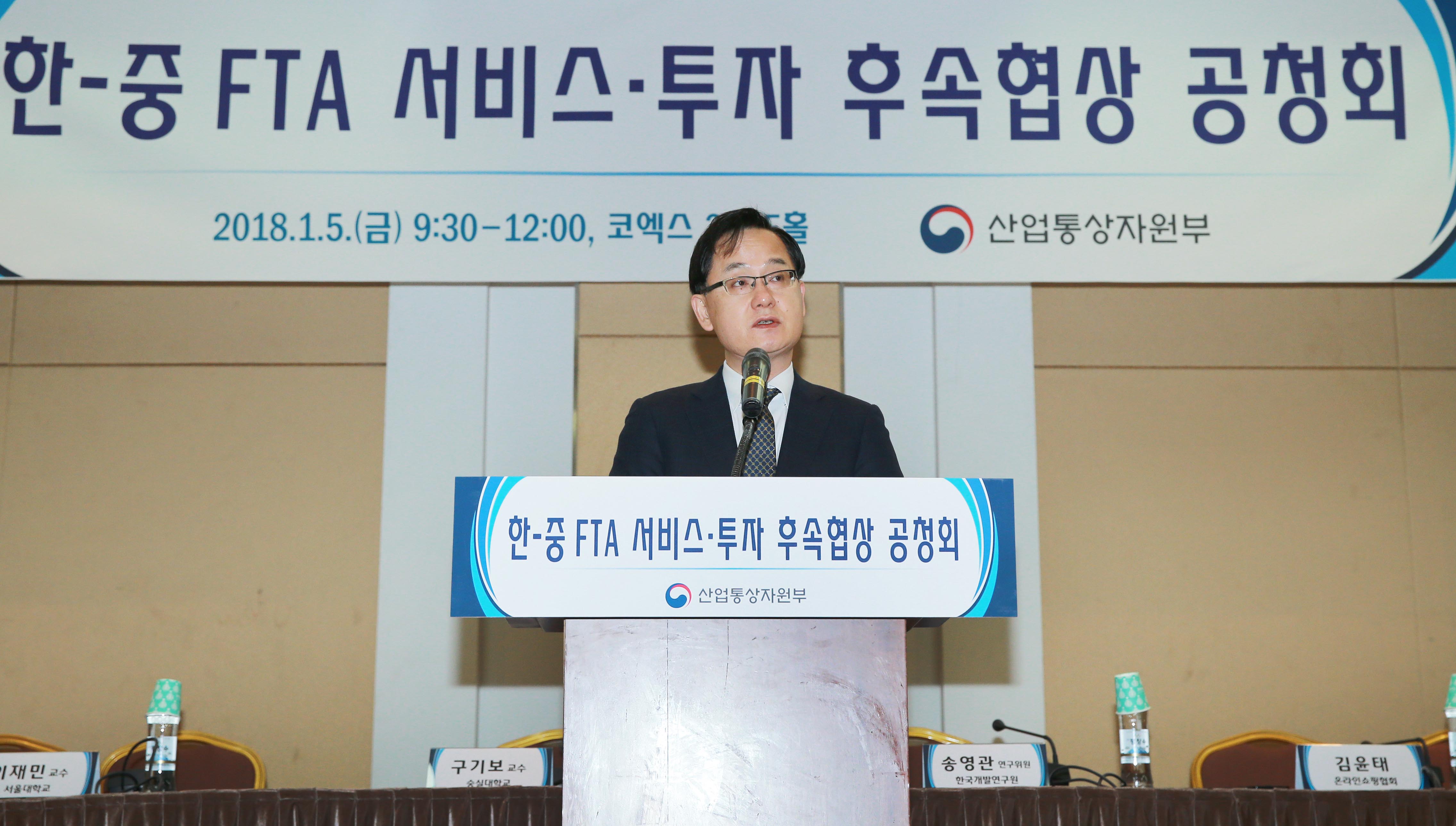 Deputy Minister for Trade Kang Sung-chun spoke at a public hearing on the follow-up negotiations for the Korea-China Free Trade Agreement (FTA) at the COEX in Southern Seoul on January 5, 2018. The Ministry of Trade, Industry and Energy hosted the public hearing to gather opinions from interested parties and experts ahead of starting negotiations to expand the Korea-China FTA to include trade in services and investments. The public hearing is one of the domestic procedures required unde date2018-01-05
