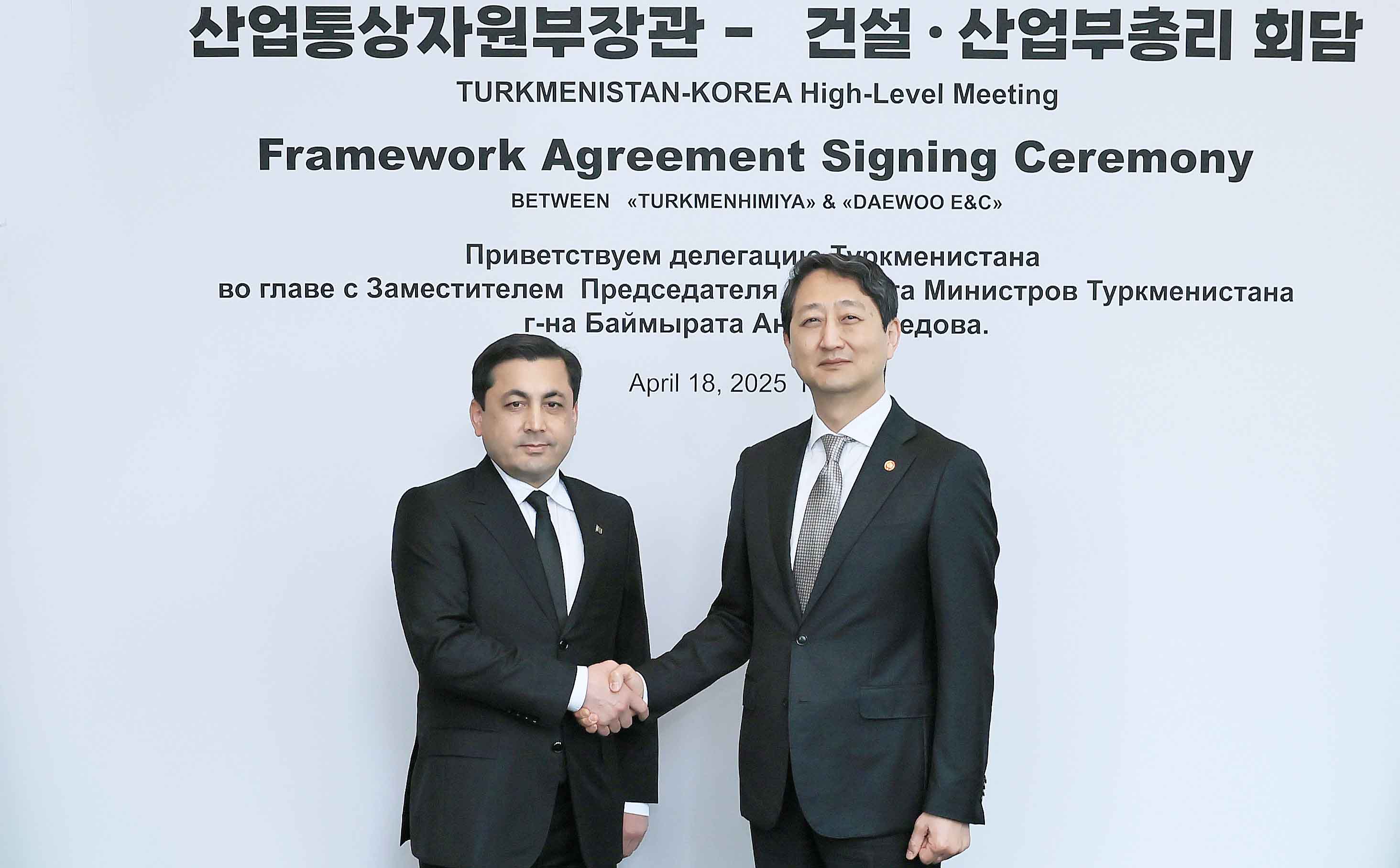 Korea’s Minister of Trade, Industry and Energy Dukgeun Ahn and Deputy Chairman of the Cabinet of Ministers of Turkmenistan for Construction and Industrial Complex Baymyrat Annamammedov attended a signing ceremony for the Framework Agreement on a $700 million mineral fertilizer plant project to be commissioned by “Turkmenhimiya” State Concern, in which Korea’s Daewoo E&C will participate as a contractor. date2025-04-21