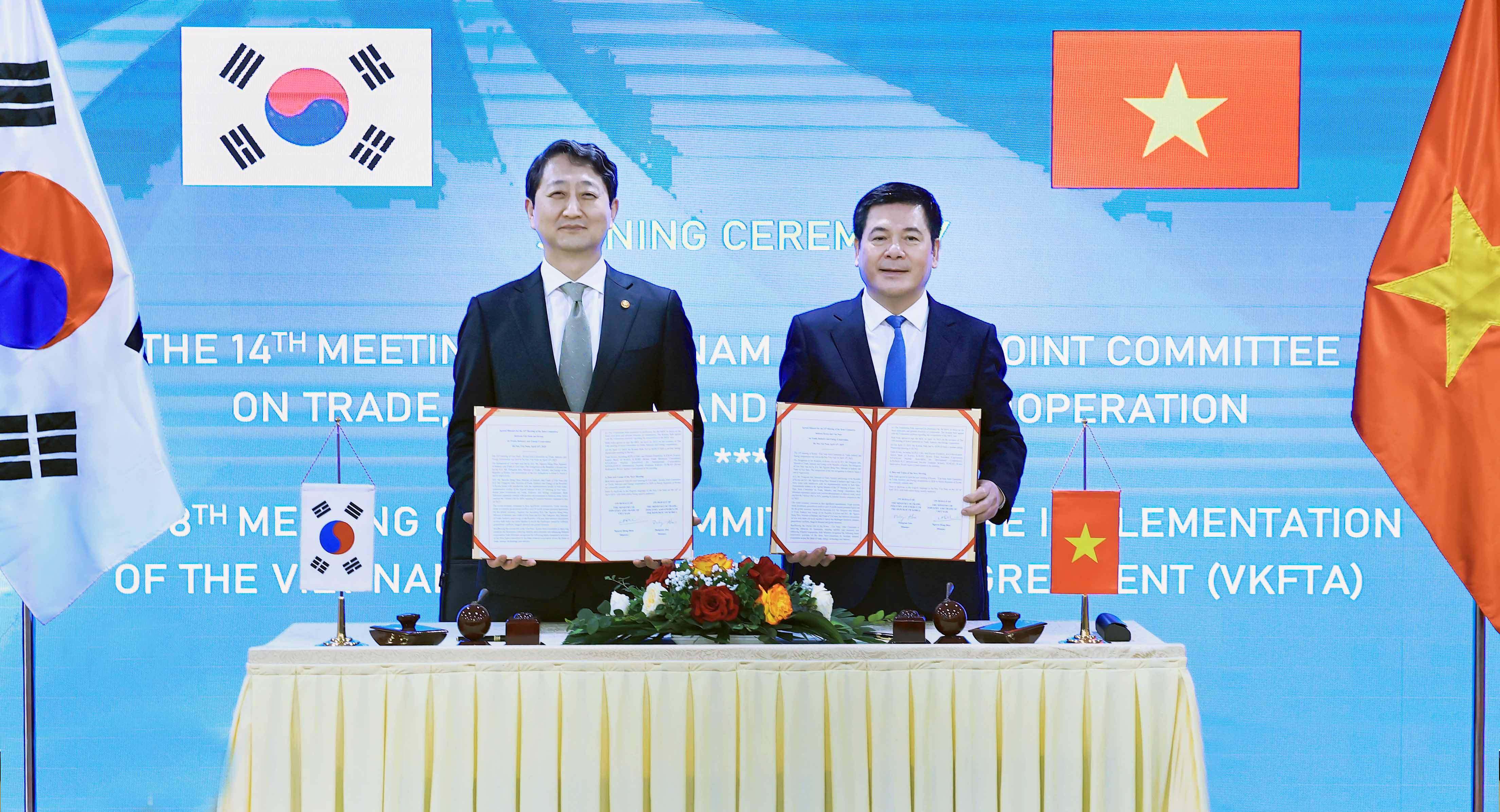 Korea’s Minister of Trade, Industry and Energy Dukgeun Ahn and Vietnam’s Minister of Industry and Trade Nguyen Hong Dien held a ceremony on April 14 in Hanoi for the signing of minutes of the 14th Korea-Vietnam Joint Industrial Committee and 8th Korea-Vietnam FTA Joint Committee meetings. date2025-04-14