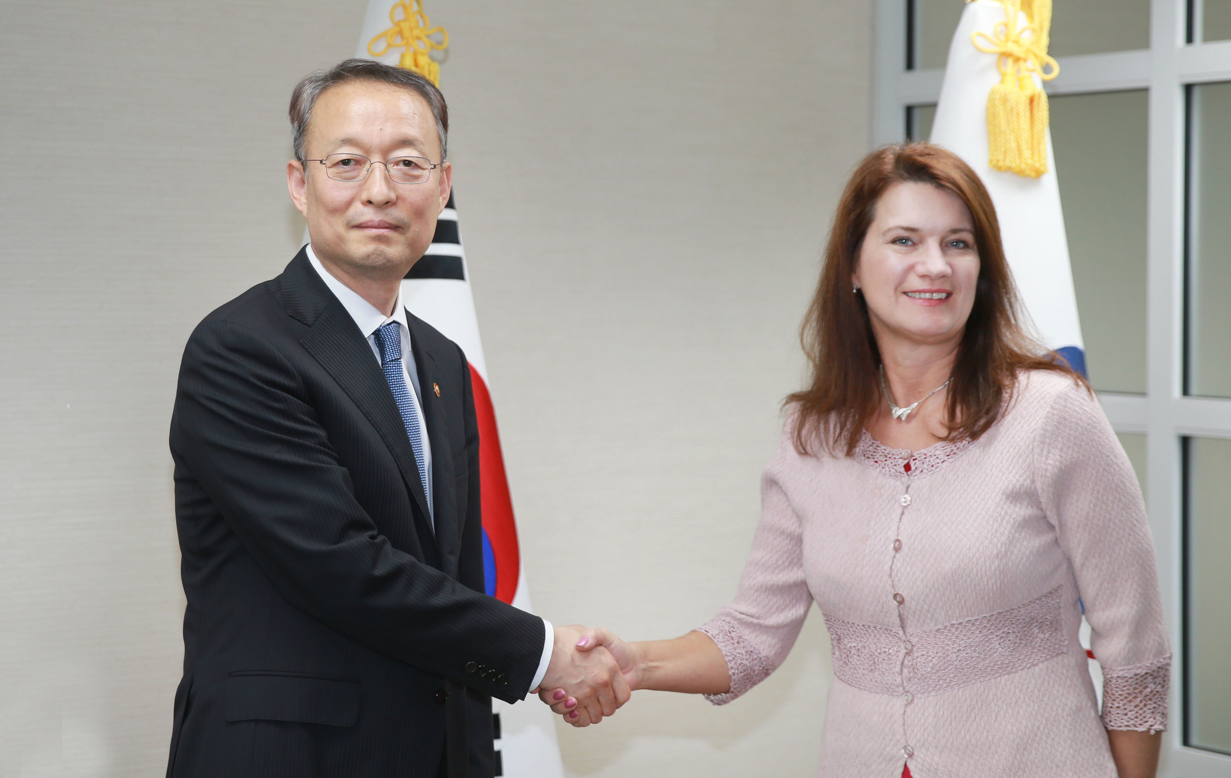 Trade, Industry and Energy Minister Paik Ungyu (left) posed for a photo with Sweden’s Minister for EU Affairs and Trade Ann Linde during their meeting at the Government Complex Seoul in downtown Seoul on September 20. Minister Paik expressed his gratitude for the Swedish Minister’s participation in the seventh ASEM (Asia-Europe Meeting) Economic Ministers’ Meeting, which the Ministry of Trade, Industry and Energy is hosting in Seoul on September 21 and 22. The two Minist date2017-09-20