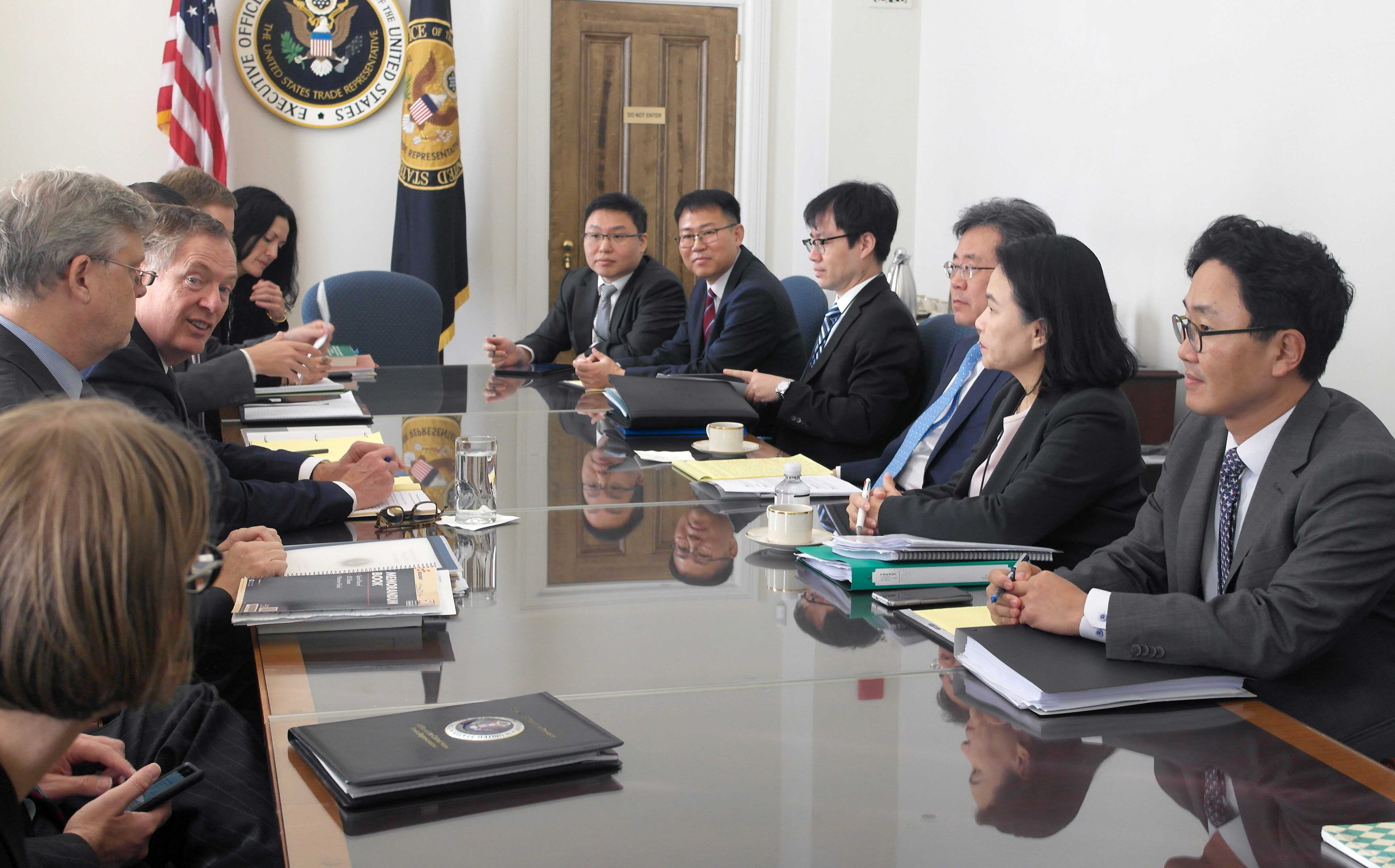 Trade Minister Kim Hyun-chong (third from right) and United States Trade Representative Robert Lighthizer (third from left) co-chaired the second special session of the Korea-U.S. Free Trade Agreement (KORUS FTA) Joint Committee on October 4 in Washington, D.C. The Korean and U.S. governments held the second special session of the KORUS FTA Joint Committee in order to continue discussions on the bilateral trade pact with a view to further improving its benefits to both sides. The s date2017-10-05