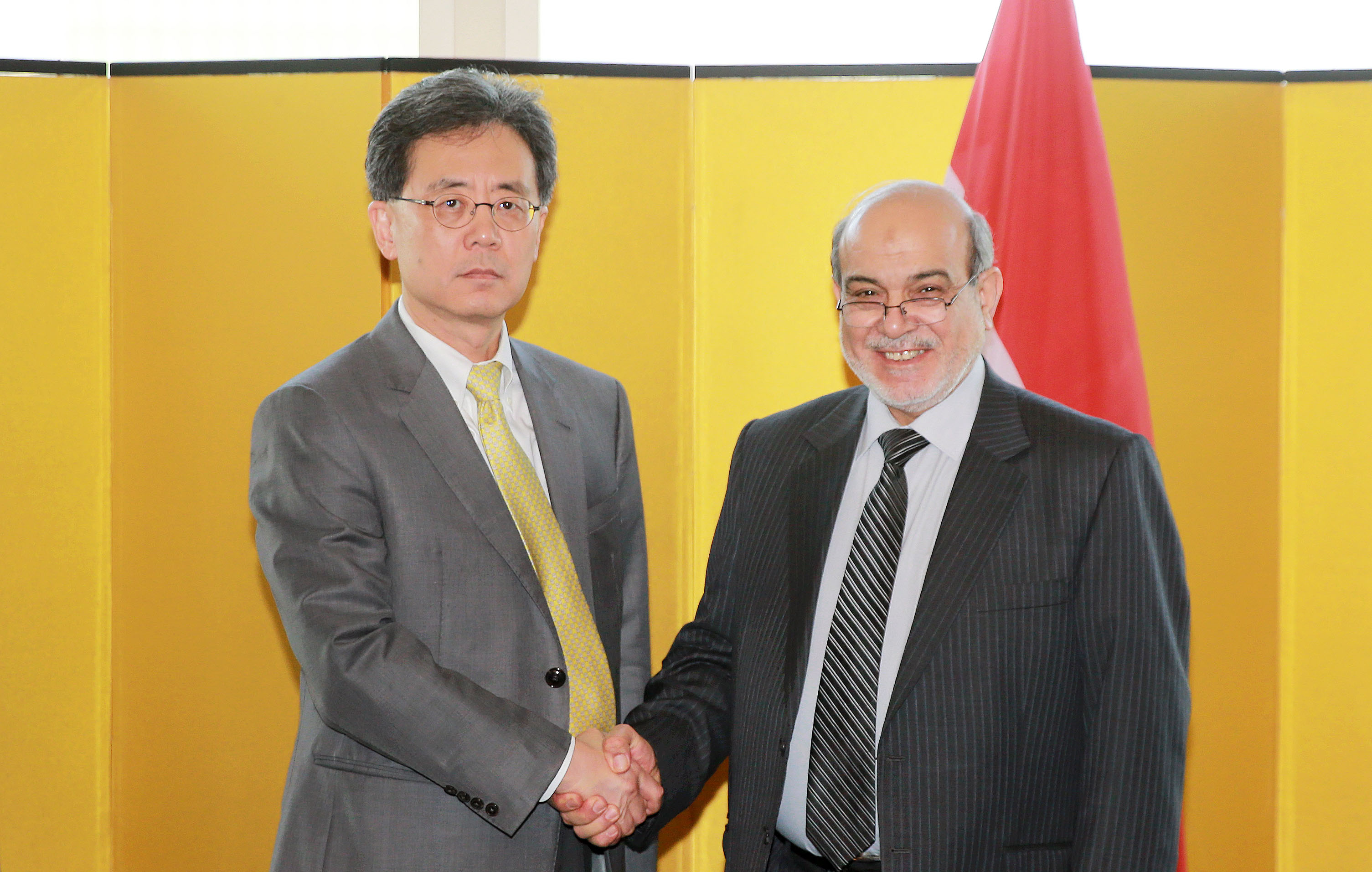 Trade Minister Kim Hyun-chong (left) posed for a photo with Iraq’s Deputy Oil Minister Fayadh Hassan Nima during their meeting at a hotel in downtown Seoul on October 23. At the meeting, the Korean Trade Minister and the Iraqi Deputy Oil Minister exchanged views on the development of the two countries’ energy industries. date2017-10-23