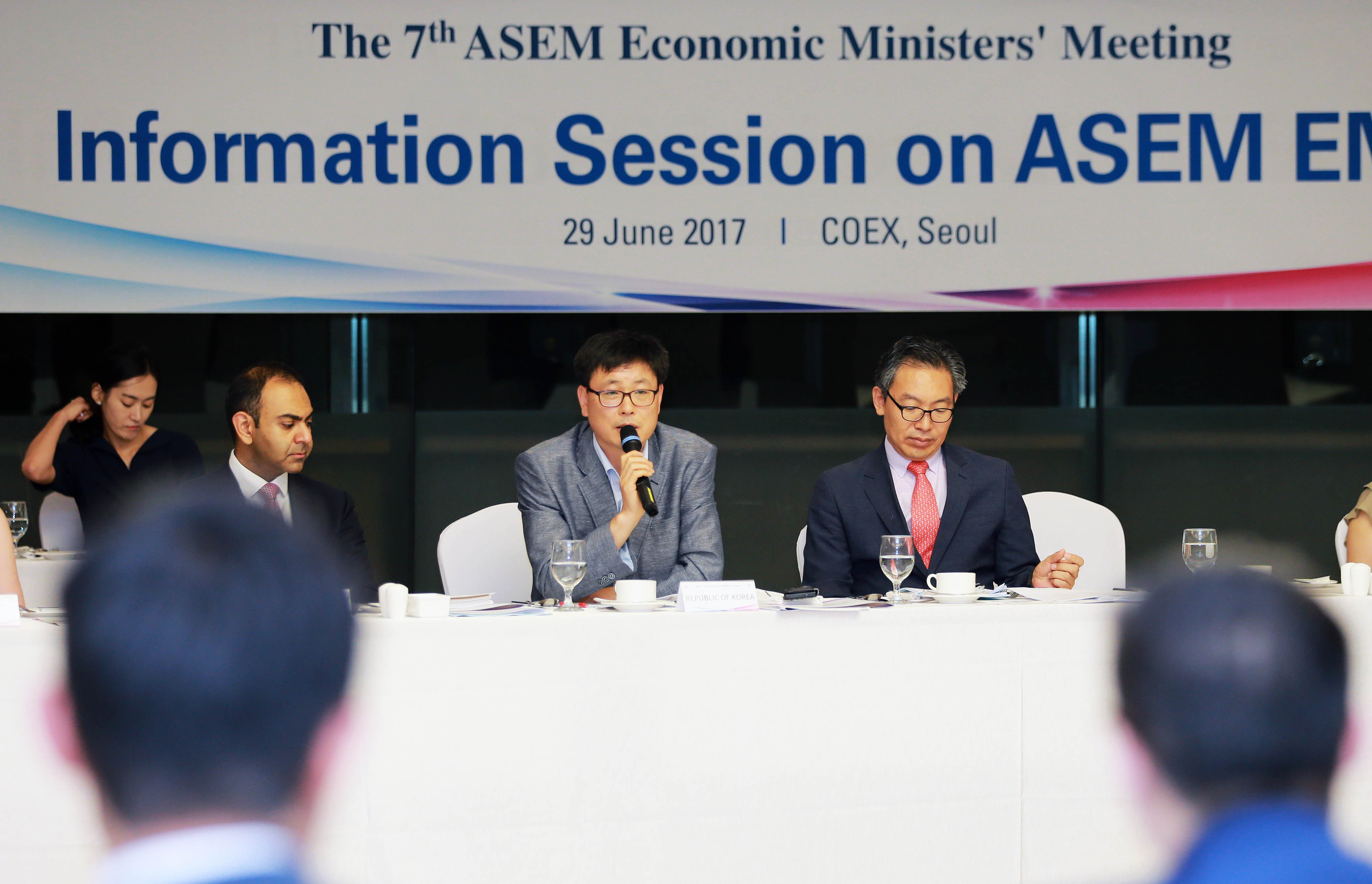 Trade, Industry and Energy Director-General for FTA Policy Lee Min-chul (second from right) spoke at the Information Session on the ASEM (ASIA-Europe Meeting) Economic Ministers’ Meeting on June 29 in Seoul. The seventh ASEM Economic Ministers’ Meeting, a gathering of trade and economy ministers from across Asia and Europe to promote trade and economic cooperation between the regions, will take place in Seoul between September 21 and 22. The Ministry of Trade, Industry and Ene date2017-06-29
