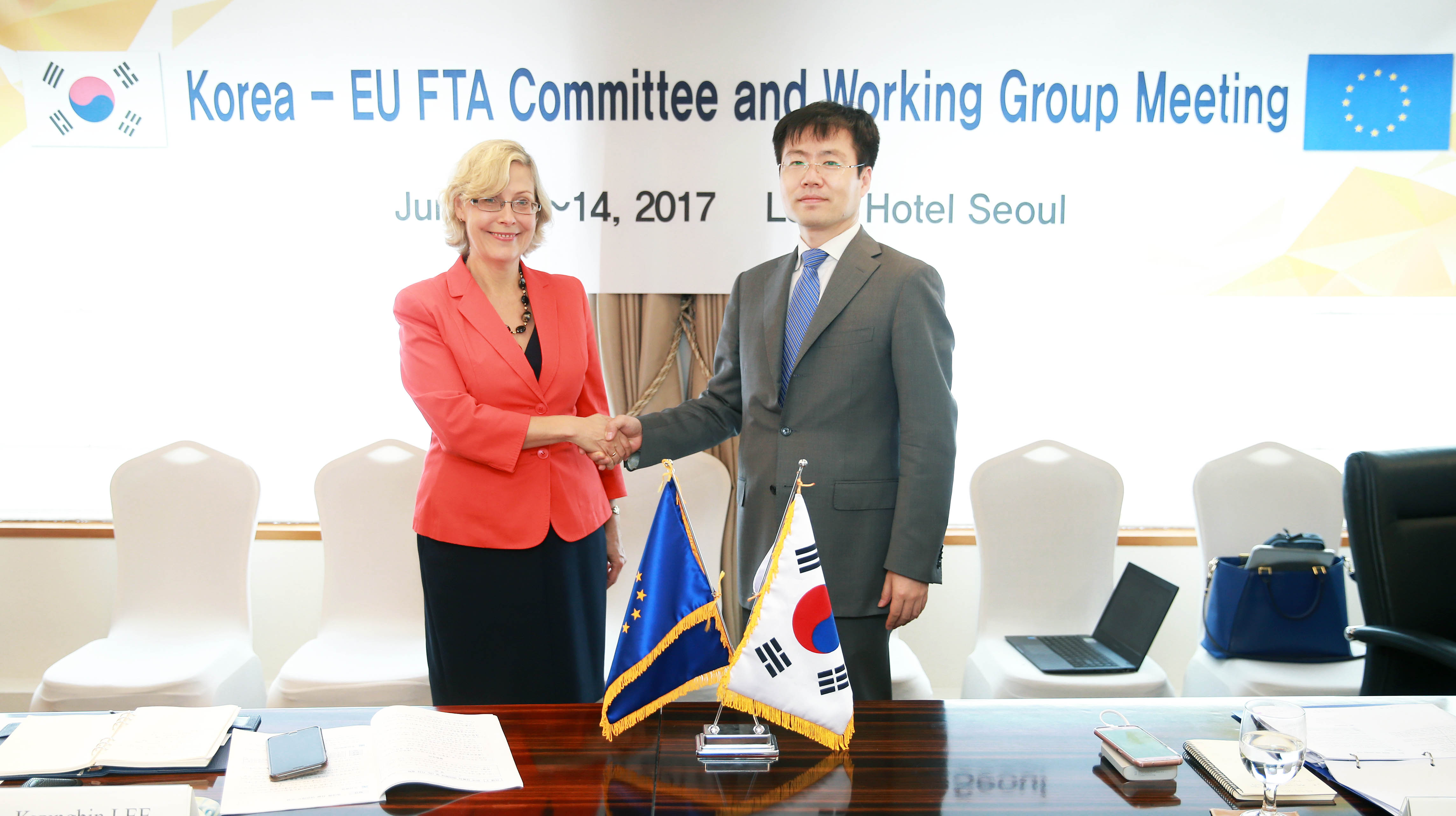 Director General for Trade Policy Yeo Han-koo (right) of the Ministry of Trade, Industry and Energy (MOTIE) and Director for Trade Strategy and Analysis Signe Ratso of the European Commission pose for a photo during the Korea-EU Free Trade Agreement Committee and Working Group Meeting in central Seoul on June 13. Various committees and working groups established under the FTA met in Seoul between June 12 and 14 to review the implementation of the agreement, resolve trade issues, and di date2017-06-13