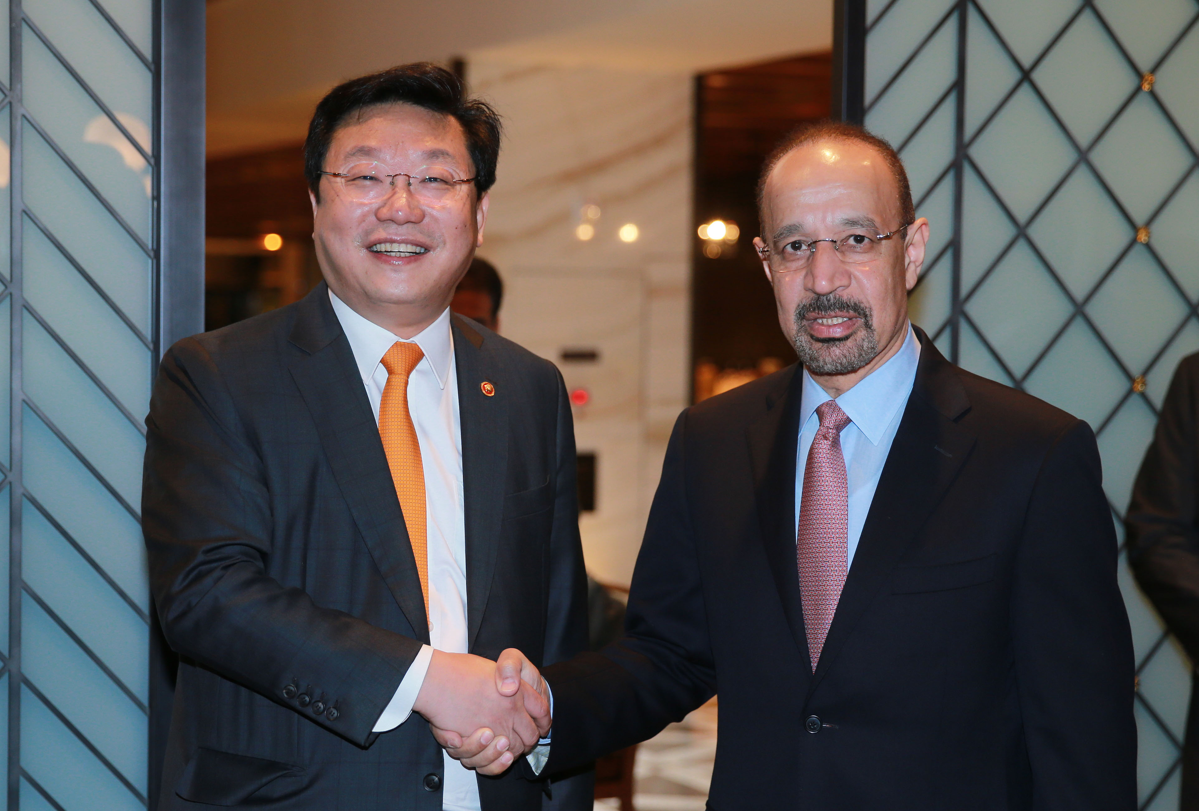 Trade, Industry and Energy Minister Joo Hyunghwan (left) poses for a photo with Saudi Arabia’s Energy, Industry and Mineral Resources Minister Khalid A. Al Falih in central Seoul on May 9, during the Saudi Minister’s visit to Korea. The two Ministers discussed bilateral cooperation for the Kingdom’s Vision 2030, an economic, industrial diversification program. date2017-05-09