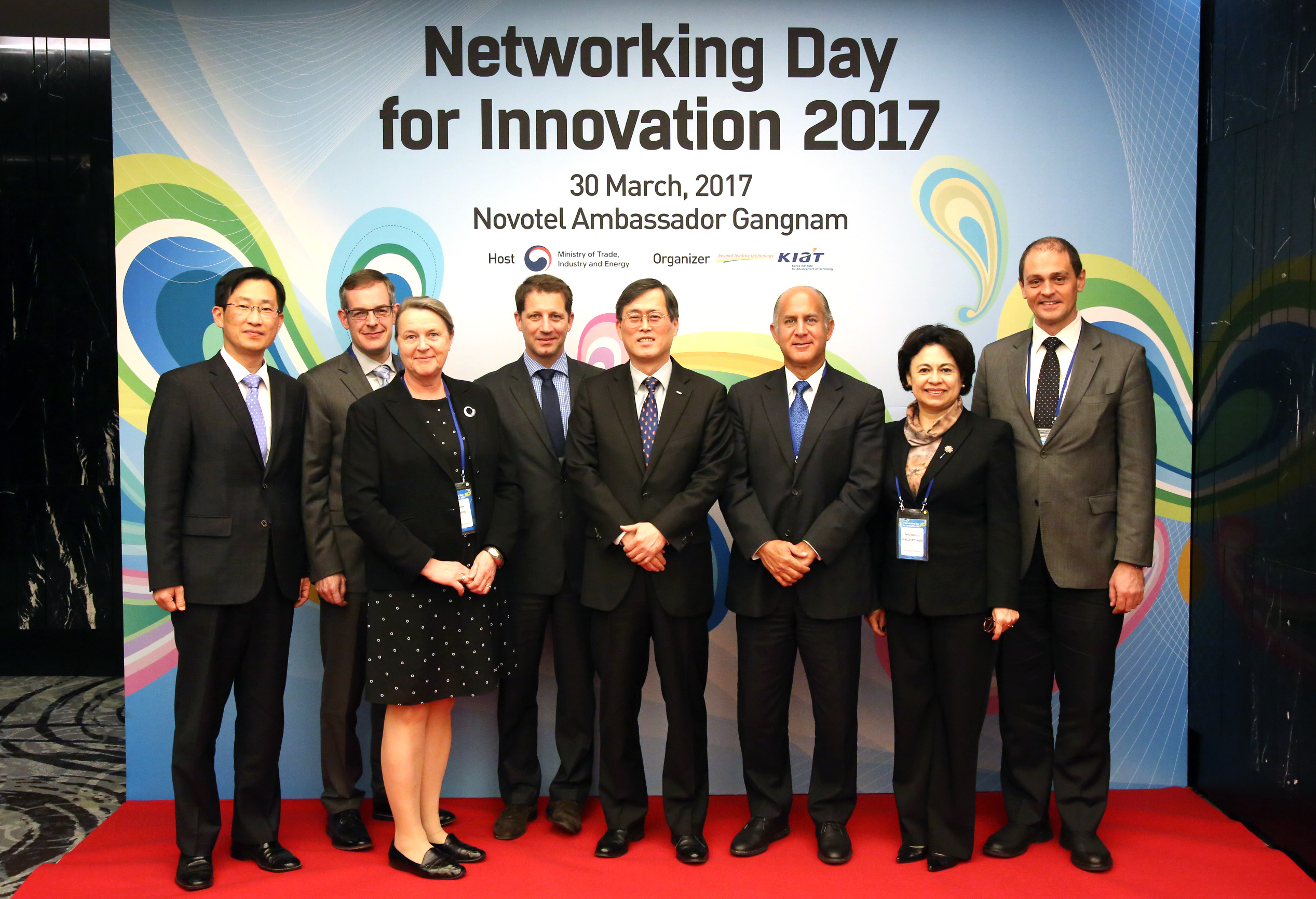 Trade, Industry and Energy Director-General for Industrial Technology Policy Park Gun-su (left) posed for a photo with representatives of foreign embassies in Korea at the Networking Day for Innovation 2017 held in southern Seoul on March 30. The Ministry of Trade, Industry and Energy hosted the event to vitalize innovative policy coordination and technological cooperation among Korea and partner countries in the era of the Fourth Industrial Revolution. Director-General Park said in a sp date2017-03-30