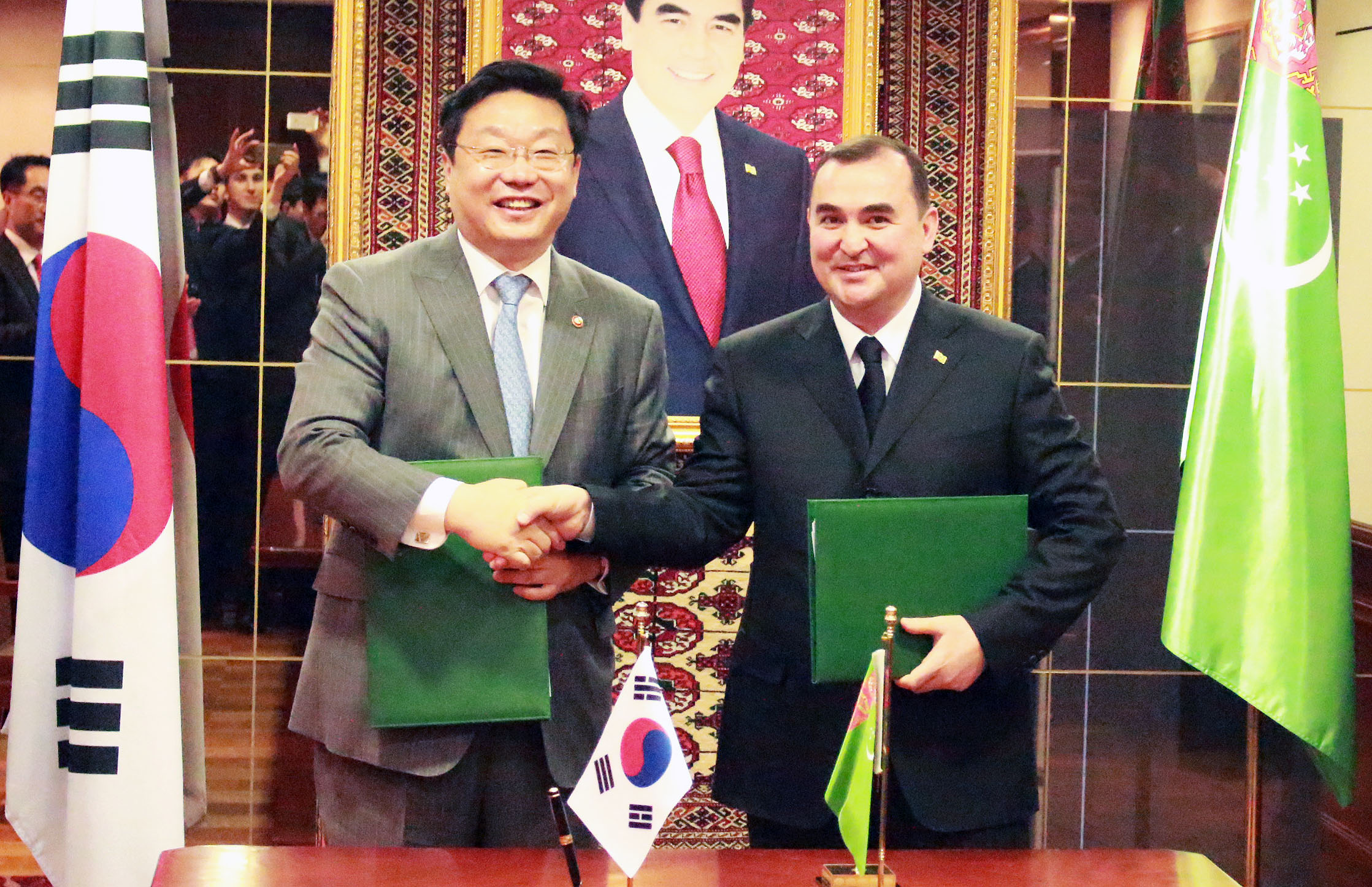 Trade, Industry and Energy Minister Joo Hyunghwan (left) shook hands with Turkmenistan's Deputy Prime Minister for Energy Affairs Maksat Babayev at the sixth meeting of the Intergovernmental Turkmen-Korean Commission for Trade, Economic, Scientific and Technological Cooperation in Ashgabat, Turkmenistan, on April 6. At the meeting, the two parties discussed the ways to further develop trade and investment and reinvigorate economic cooperation. date2017-04-06