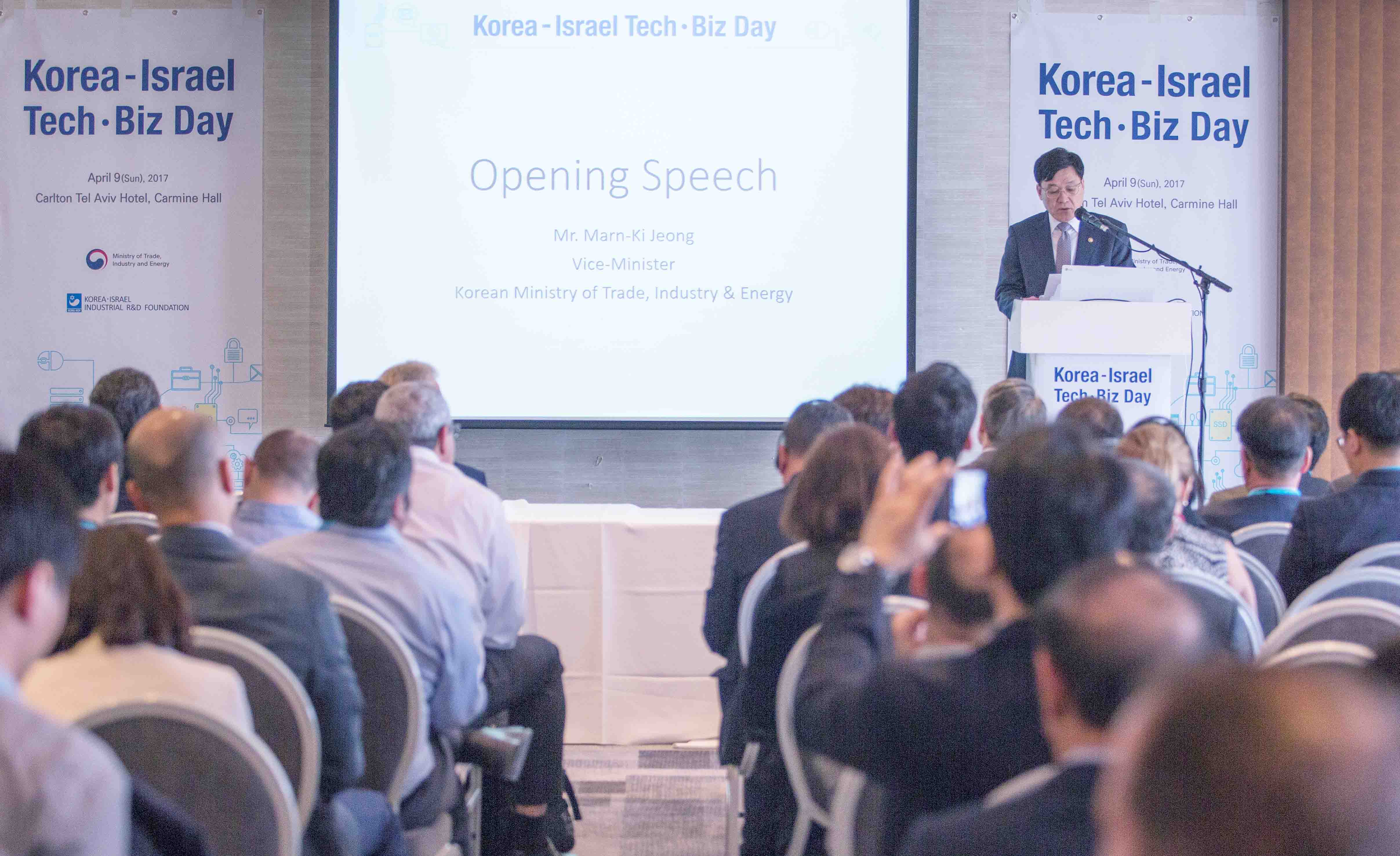 Trade, Industry and Energy Vice Minister Jeong Marn-ki delivered an opening speech in the “Korea-Israel Tech-Biz Day” forum at Carlton Tel Aviv Hotel in Israel on April 9. Israel’s Deputy Prime Minister for Diplomacy Michael Oren and some 150 representatives from companies and organizations from the two countries attended the forum, which aims to strengthen cooperation in technology between Korea and Israel through exchange programs and investment consultations. A date2017-04-09