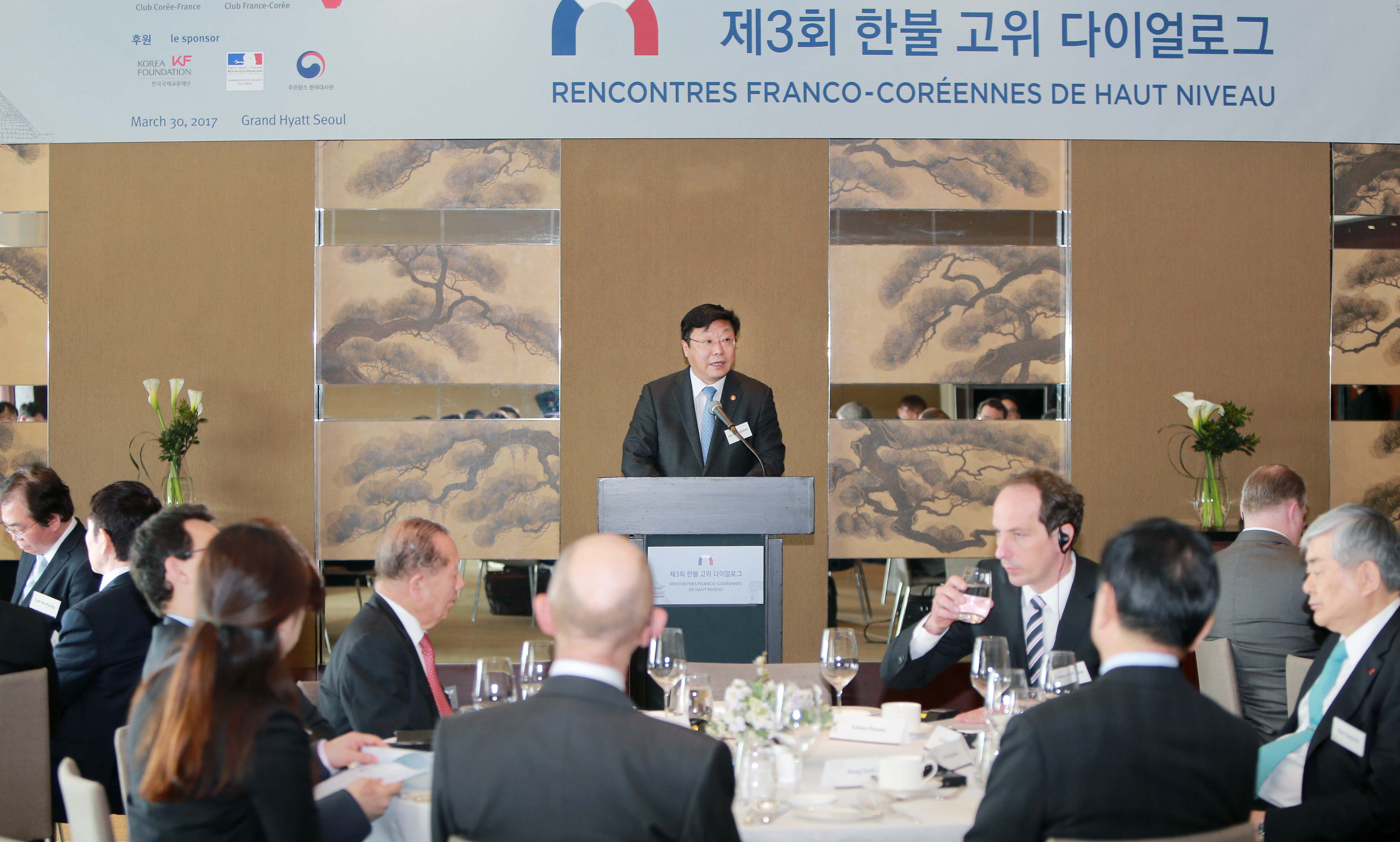 Trade, Industry and Energy Minister Joo Hyunghwan (center) delivered a speech at the third Korea-France High Level Dialogue held in central Seoul on March 30. At the meeting, Minister Joo underscored the Korean government will strive to solve difficulties and inconveniences foreign firms may experience in Korea amid uncertainties at home and abroad including the rising protectionism. Minister Joo proposed expansion of bilateral trade and investment, joint responses to the Fourth Industria date2017-03-30