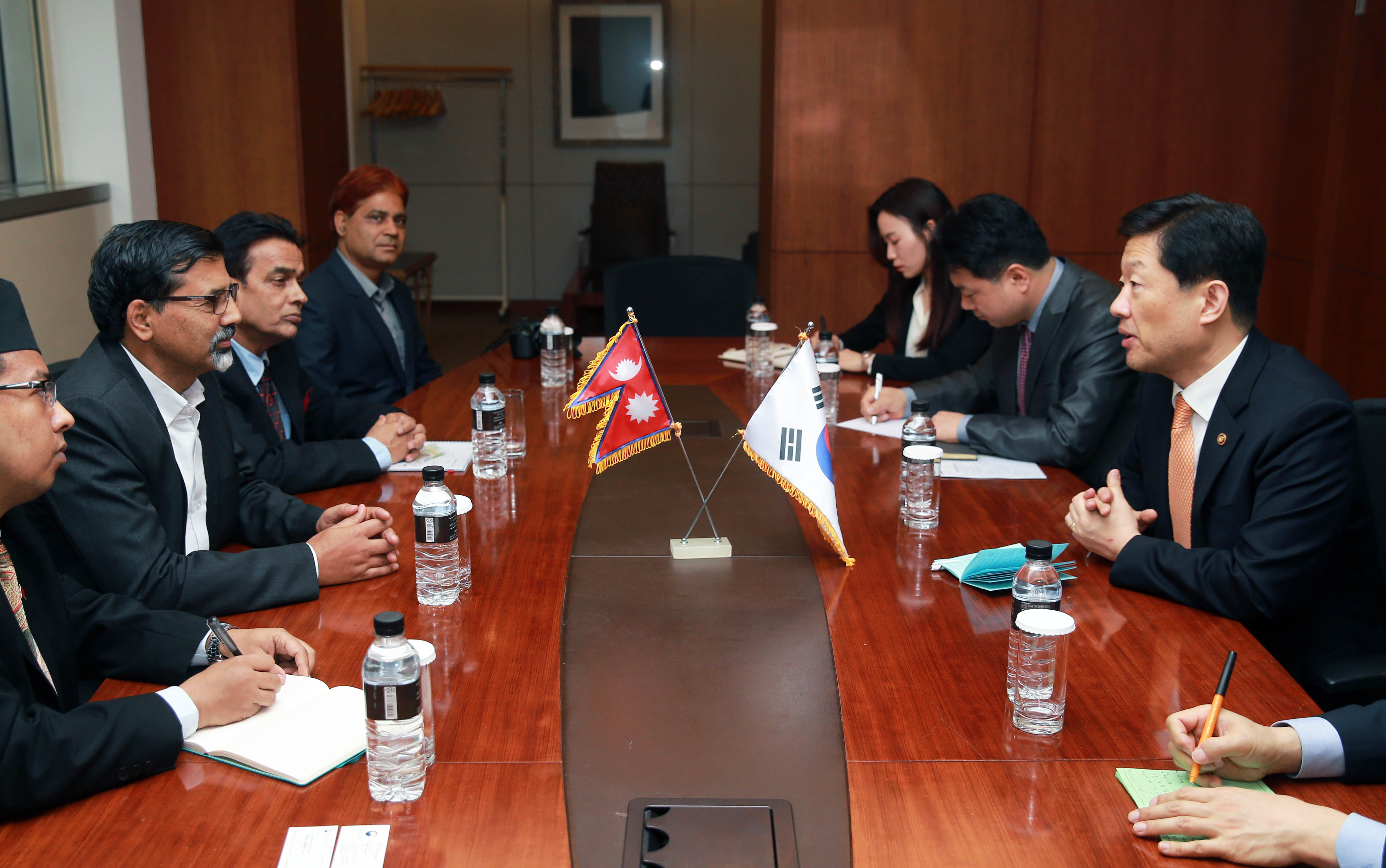 Trade, Industry and Energy Vice Minister Woo Taehee (right) met with Nepal’s Minister for Energy Janardan Sharma (second from left) and his delegation in southern Seoul on Monday 20. Vice Minister Woo and Minister Sharma discussed the two countries’ cooperation in the fields of energy and resources. date2017-03-20