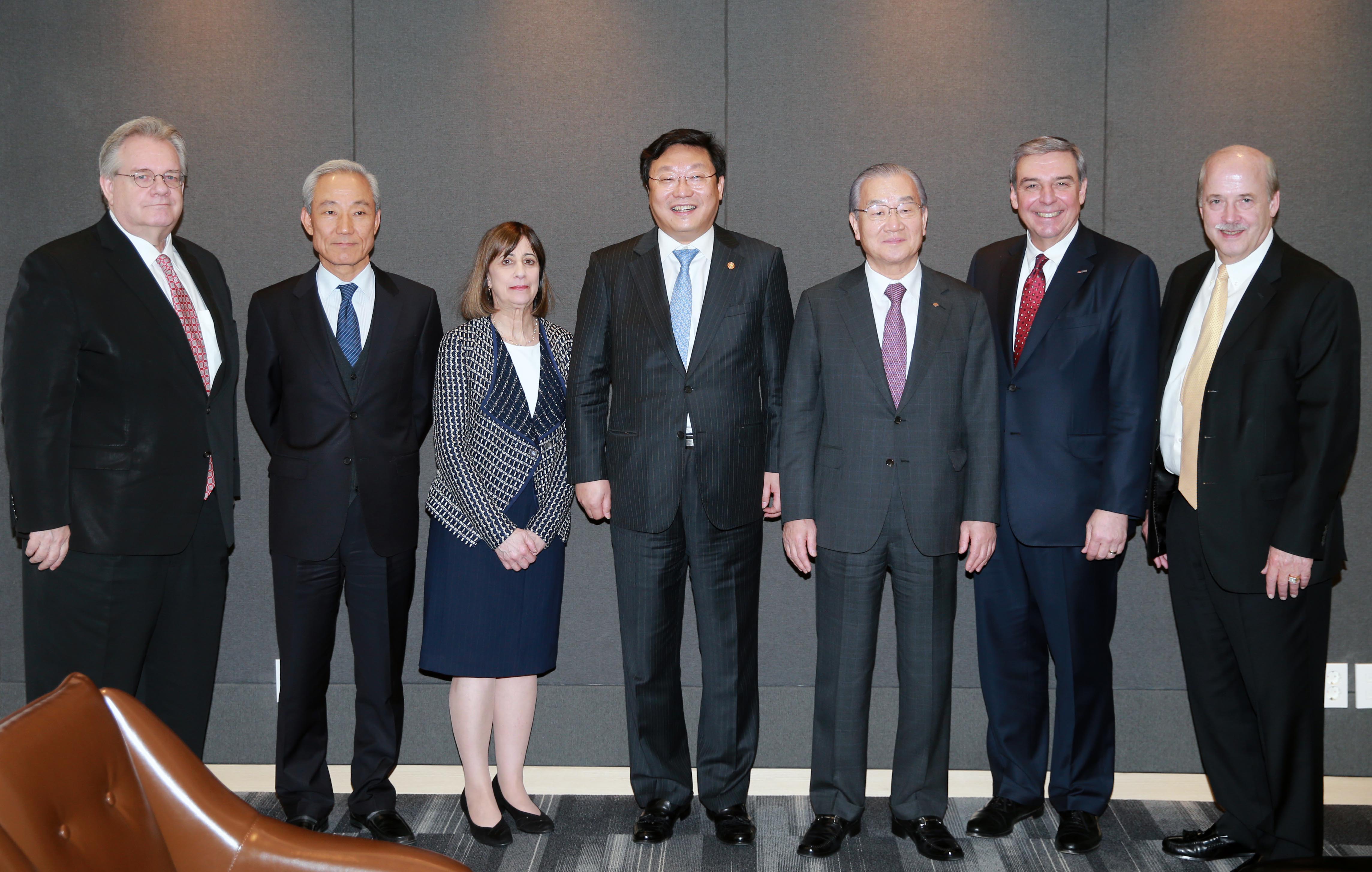 Trade, Industry and Energy Minister Joo Hyunghwan (center) posed for a photo with key Korean and U.S. officials involved in the negotiations or implementation of the Korea-U.S. Free Trade Agreement (KORUS FTA) at the KORUS FTA 5th Anniversary Seminar held in the COEX, southern Seoul, on March 14. At the event, Minister Joo delivered a congratulatory speech, highlighting the mutually beneficial outcomes of the KORUS FTA and the importance of continuous expansion of bilateral cooperation in date2017-03-14