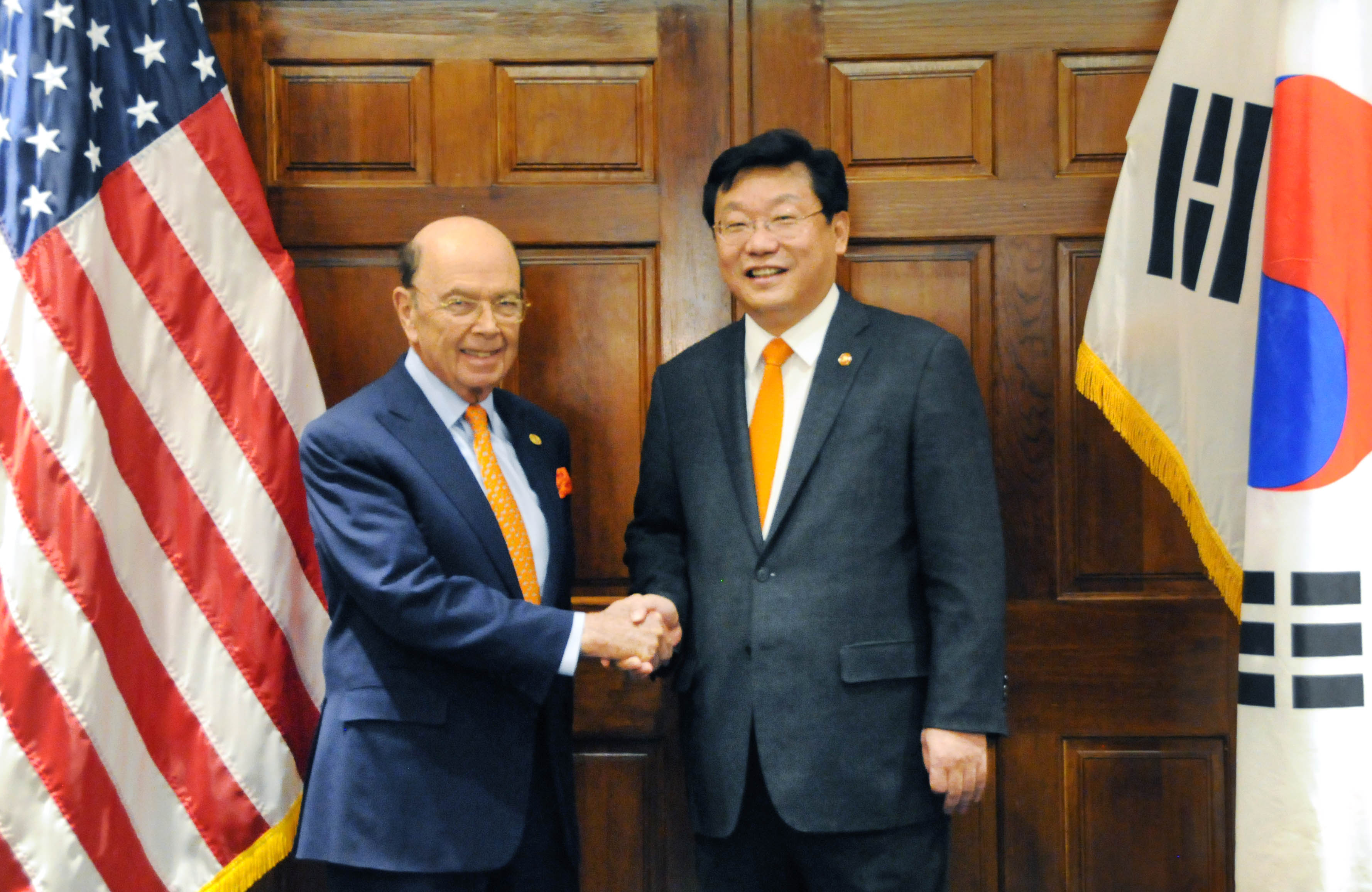 Trade, Industry and Energy Minister Joo Hyunghwan (right) poses with US Secretary of Commerce Wilbur Ross in Washington on March 8, 2017 (local time). Korea's trade minister met his new U.S. counterpart during his outreach trip to the U.S., designed to build a channel for economic cooperation and bilateral communication under Donald Trump's administration. date2017-03-09